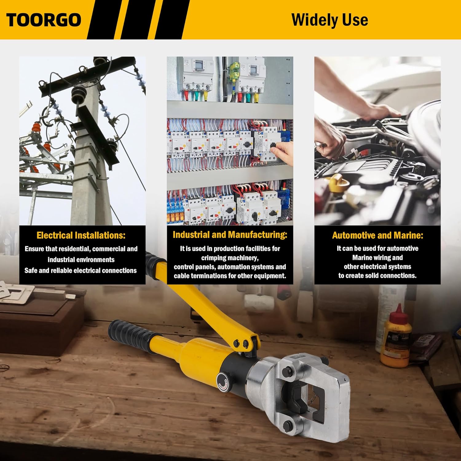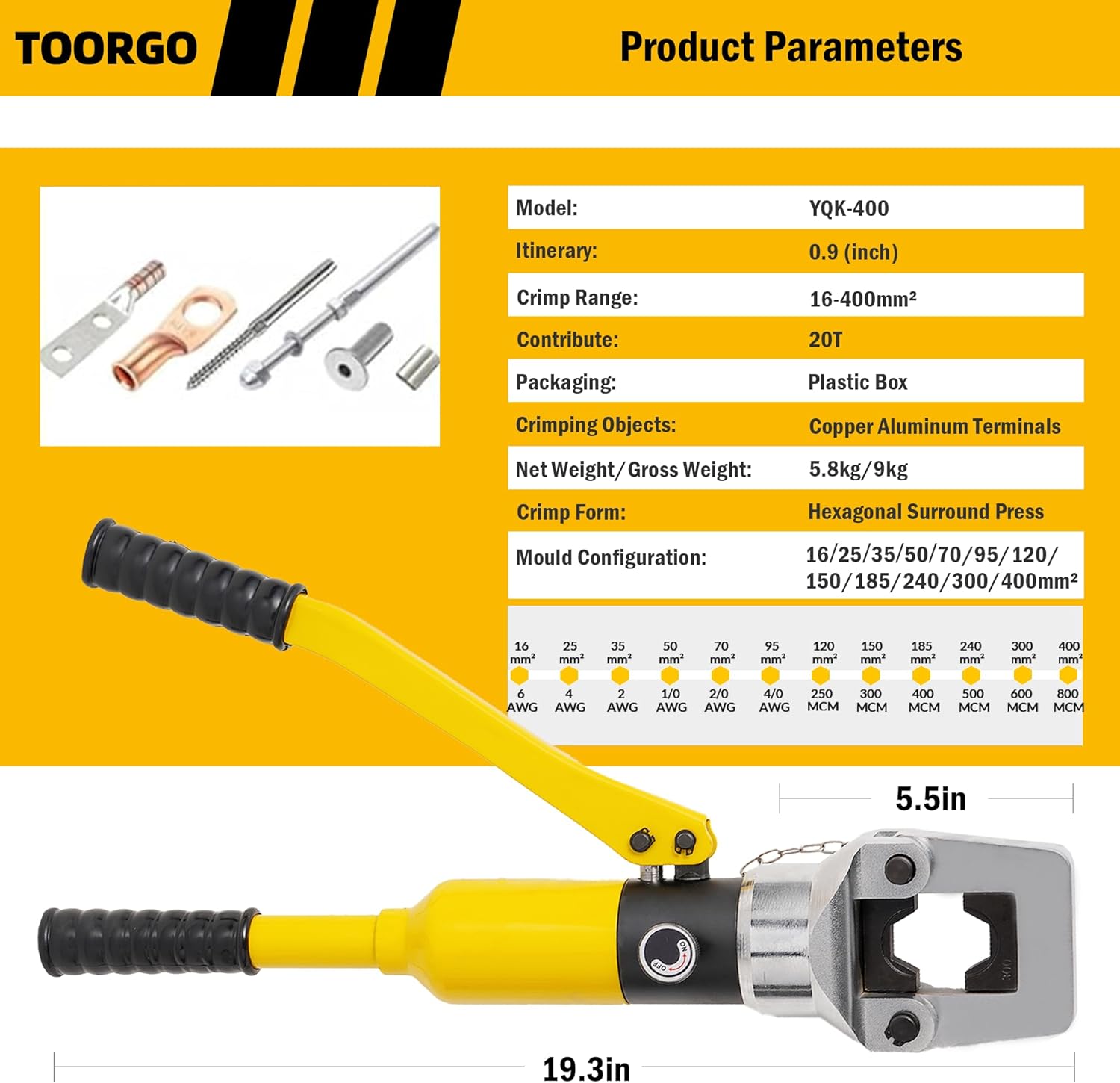 TOORGO's new hydraulic tool is suitable for crimping wires, terminals, and lugs. The ergonomic long handle provides comfort and labor-saving benefits. With 6 sizes and various dies for different crimping ranges, this versatile tool offers a wide range of applications. Its sturdy steel construction ensures stable and tight crimping, while the safety valve prevents over-pressurization. The rotating head and portable toolbox add convenience for working in tight spaces and easy storage.