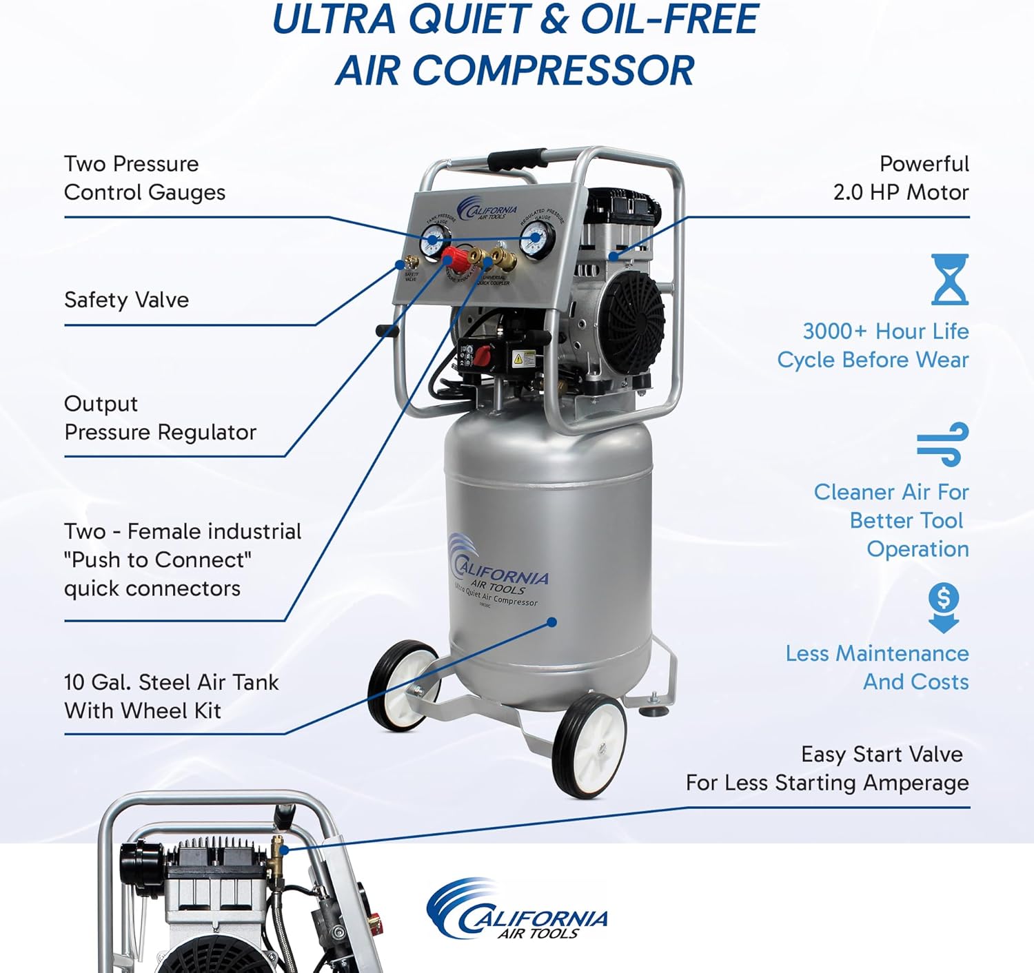California Air Tools 10020C 2.0 HP Ultra Quiet and Oil-Free Air Compressor, 10 Gallon Steel Tank with Wheels, 70 dBA Noise Level