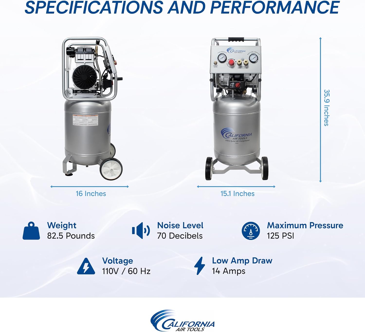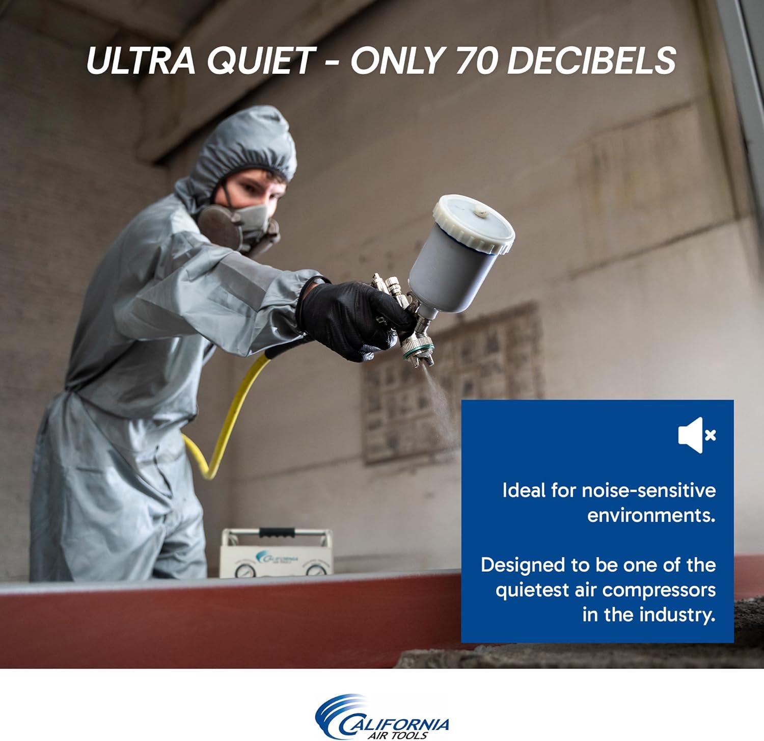 The California Air Tool 2.0 Hp Ultra Quiet & Oil-Free Air Compressor is designed to be one of the quietest air compressors in the industry, emitting only 70 decibels of sound. This makes this super quiet air compressor perfect for any workspace where noise is a concern. Powered by a powerful 2.0 HP motor operating at just 1680 RPM, it delivers robust performance with less noise and reduced wear, ensuring a longer lifespan and more efficient operation. This oilless air compressor features an oil-free dual piston pump system that is designed for high performance and durability. With a life cycle of over 3000 hours, it significantly outlasts comparable models. The 10-gallon steel tank is ideal for jobsite, shop, and garage use, providing ample air capacity with a maximum pressure of 125 PSI. Weighing 82.5 pounds and equipped with a convenient wheel kit, this 10 gallon air compressor with wheels is remarkably easy to maneuver and position exactly where you need it. From project to project, its mobility ensures that setting up and moving are as effortless as possible. This compressor also includes features such as two pressure control gauges and industrial "Push to Connect" quick connectors, enhancing its ease of use and efficiency. At California Air Tools, we pride ourselves on delivering innovative, top-tier technology in air compressors that meet the needs of both professionals and hobbyists without compromising on power or user-friendliness. Elevate your workspace with the California Air Tools Ultra Quiet & Oil-Free Air Compressor. Discover the bliss of superior performance coupled with whisper-quiet operation, designed to enhance your efficiency and comfort.
