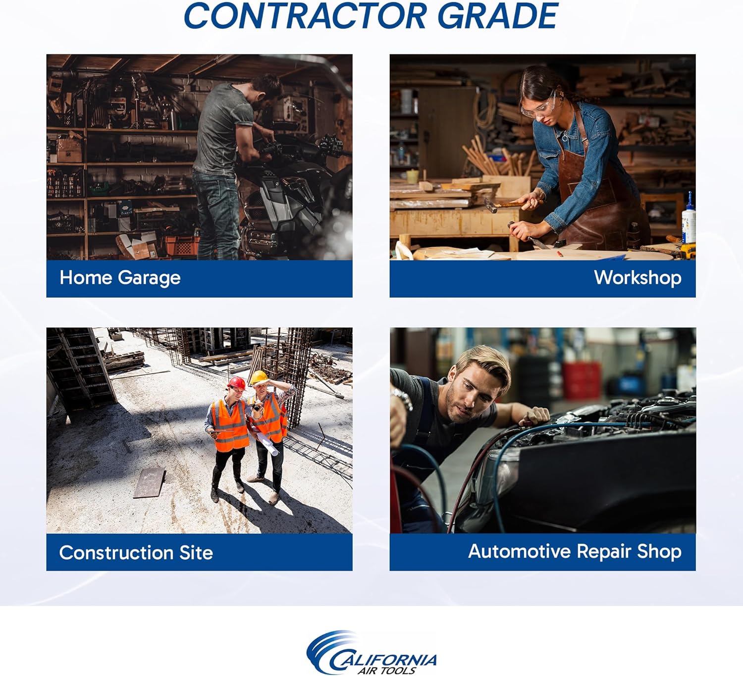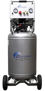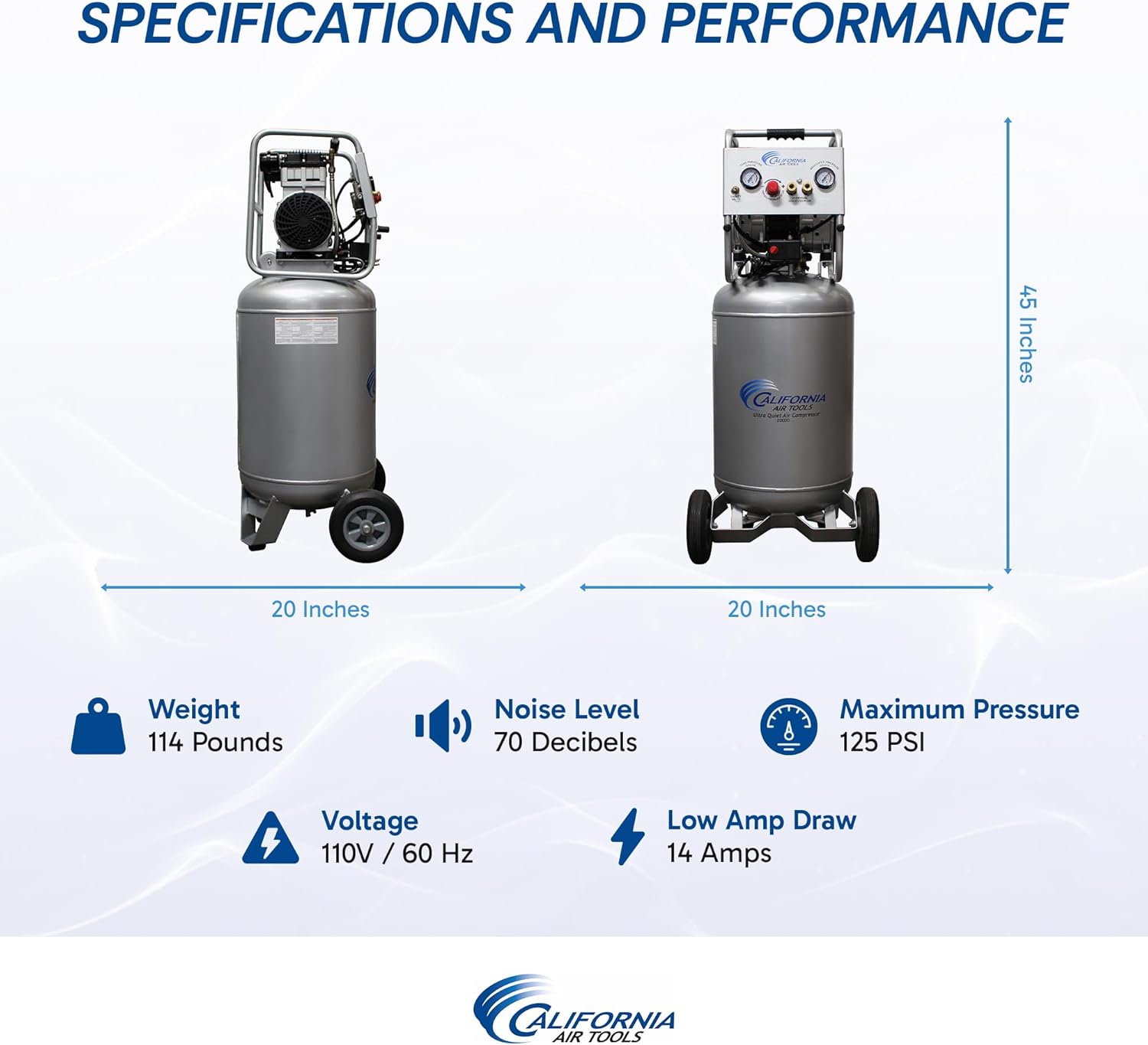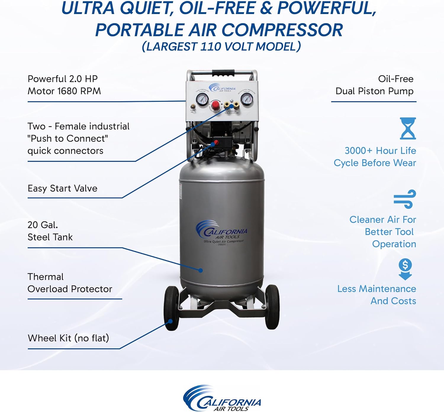 The California Air Tools Ultra Quiet, Oil-Free and Powerful 2.0 Hp Portable 20-Gallon Air Compressor stands as one of the quieter compressors in the industry, with a noise level of just 70 decibels. Ideal for environments where noise is a concern, this super quiet air compressor integrates seamlessly into any workspace. It is powered by a powerful 2.0 HP motor that runs at a low 1680 RPM, offering powerful performance with minimal noise and wear, thereby extending its lifespan and boosting efficiency. The largest 110 volt air compressor model available. Featuring an oil-free dual piston pump system, this oilless air compressor is engineered for high performance and lasting durability, with a life cycle surpassing 3000 hours—outperforming similar models. With a maximum pressure of 125 PSI, the 20-gallon air tank is designed to store more air for higher demand air tools such as spray guns and sanders. Perfect for the shop or garage. Weighing 114 pounds, this air compressor is effortlessly portable with its wheels (no flat). It’s also equipped with dual pressure gauges and two industrial "Push to Connect" quick connectors for enhanced usability and efficiency. At California Air Tools, we pride ourselves on delivering innovative, top-tier technology in air compressors that meet the needs of both professionals and hobbyists without compromising on power or user-friendliness. Elevate your workspace with the California Air Tools Ultra Quiet, Oil-Free and Powerful 2.0 Hp Portable 20-Gallon Air Compressor. Discover the bliss of superior performance coupled with whisper-quiet operation, designed to enhance your efficiency and comfort.