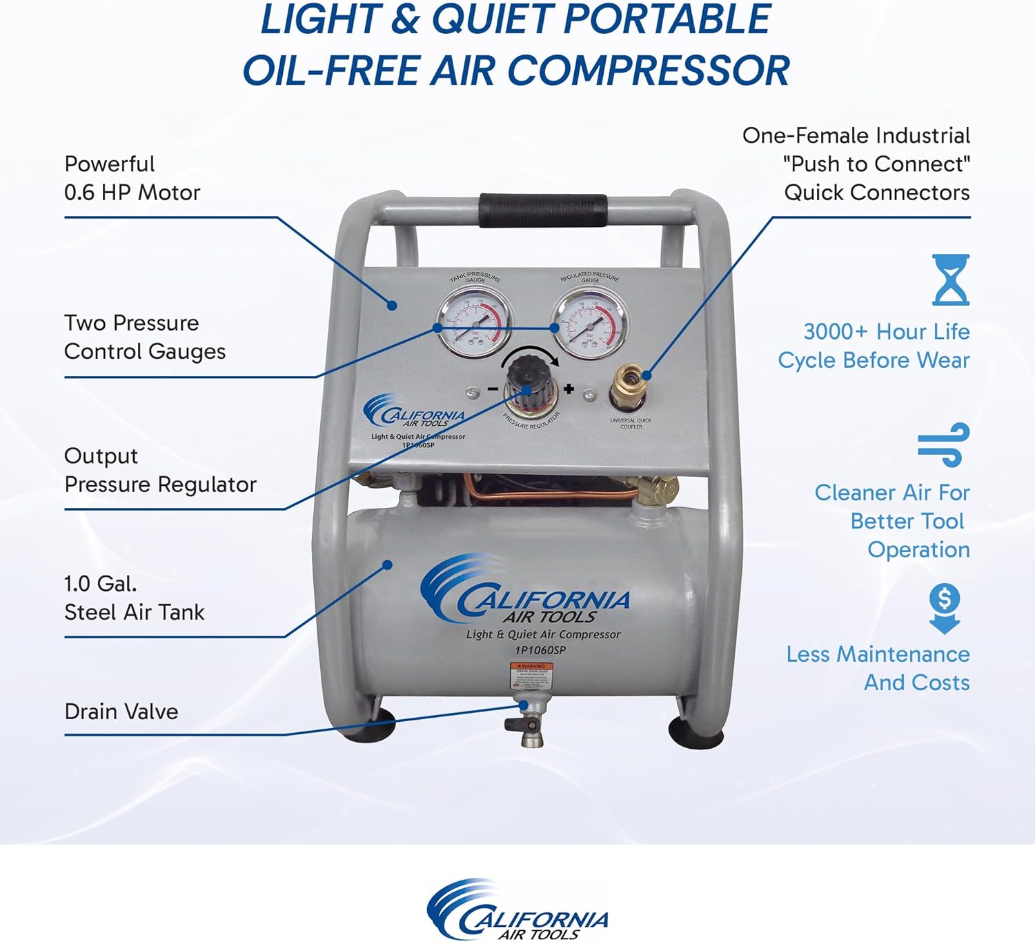 The California Air Tools light and quiet 1P1060SP portable air compressor is designed to be one of the quietest air compressors in the industry at only 56 db of sound. The 1.2 HP motor operates at only 1680 RPM, creating less noise and less wear. The updated in.Ip in. Ultra Quiet and oil-free motor is a single Piston pump design engineered for high performance and durability. The 1.0 GAL. Steel Air tank is lightweight (34 lbs.), making it very easy to transport. This compressor has an oil-free single Piston pump designed to have a life cycle before wear of 3000 Plus hours compared to other comparable air compressors with life cycles of 250 hours or less. The oil-free pump allows for use in a variety of different temperatures (cold) and uneven terrains. The 1P1060SP produces 1.2 CFM at 90 PSI, allowing you to use staple guns, brad nail guns, finish Nail guns, nail guns, airbrushes and blow guns. It's great for the garage and perfect for cleaning or inflating tires, beds, toys and sport balls. Its quiet design is ideal for anyone working inside where noise is a major issue.