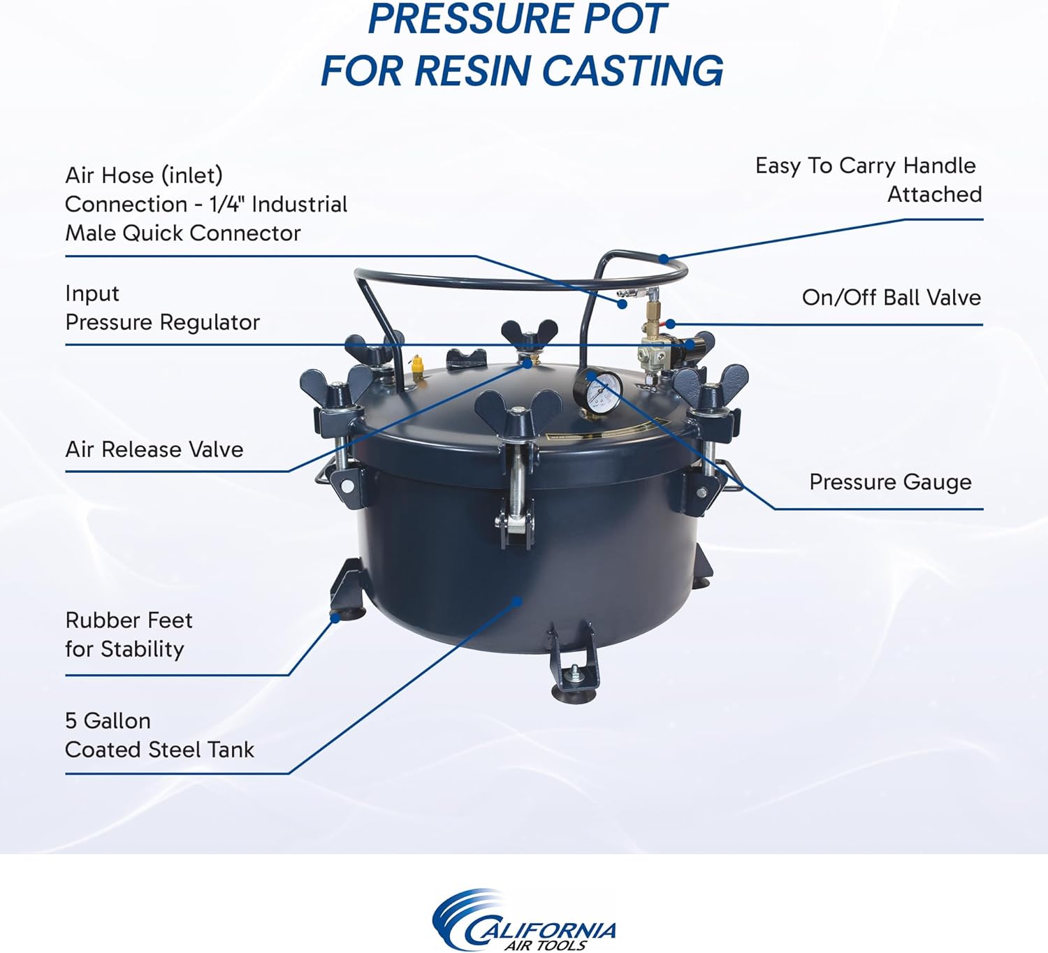 The California Air Tools Pressure Pot for Resin Casting is your go-to solution for reliable and efficient casting projects. With its robust coated steel tank, this pressure pot ensures easy clean-up after each use, making maintenance a breeze. The durable construction guarantees long-lasting performance, making it an essential tool for any workspace. Whether you're a professional or a hobbyist, this epoxy resin pressure pot is designed to meet your casting needs with ease and efficiency.Stability and control are crucial when working on casting projects, and the California Air Tools pressure chamber for casting delivers on both fronts. The pressure pot is equipped with removable caster wheels for easy mobility and stability during use. The included input connector, regulator, on/off ball valve, and pressure relief valve provide precise control over the casting process, ensuring safe and efficient operation every time. Designed with convenience in mind, the California Air Tools pressure pot for epoxy resin casting features an easy-to-carry handle, making it effortless to transport and use in different locations. With a maximum pressure of 80 PSI and an operating pressure of 60 PSI, it is ideal for a wide range of casting applications. At California Air Tools, we pride ourselves on delivering innovative, top-tier technology in air compressors that meet the needs of both professionals and hobbyists without compromising on power or user-friendliness.Experience the ultimate in casting convenience and efficiency with the California Air Tools Pressure Pot for Resin Casting. Its robust design, precise control, and portability make it the perfect tool for all your casting projects