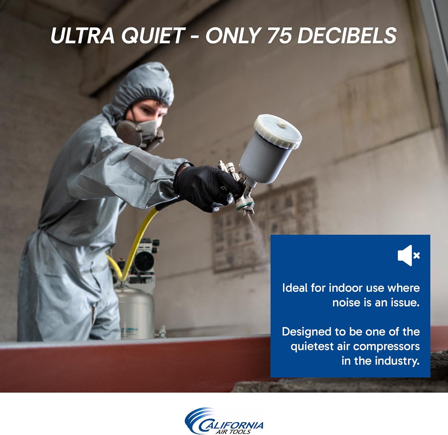 The California Air Tool 4.0 Hp Ultra Quiet & Oil-Free Air Compressor is designed to be one of the quietest air compressors in the industry, emitting only 75 decibels of sound. This makes this super quiet air compressor perfect for any workspace where noise is a concern. Powered by twin 2.0 HP motors operating at just 1680 RPM, it delivers robust performance with less noise and reduced wear, ensuring a longer lifespan and more efficient operation. This oilless air compressor features an oil-free dual piston pump system that is designed for high performance and durability. With a life cycle of over 3000 hours, it significantly outlasts comparable models. The large 60-gallon steel ASME air tank is ideal for both shop and garage use, providing ample air capacity with a maximum pressure of 125 PSI. This 60 gallon air compressor comes equipped with the EZ-1 Automatic Drain Valve, factory installed to make maintenance effortless. This innovative feature eliminates the need for manual draining by allowing you to set the frequency and duration of the draining process using a pre-set timer. With its compact and portable design, the California Air Tool 4.0 Hp Ultra Quiet & Oil-Free Air Compressor fits easily into any workspace, while the non-skid rubber feet keep it securely in place. The durable, textured handle makes it easy to move around, and the low amp draw of just 14 amps ensures efficient operation. At California Air Tools, we pride ourselves on delivering innovative, top-tier technology in air compressors that meet the needs of both professionals and hobbyists without compromising on power or user-friendliness. Elevate your workspace with the California Air Tools 4.0 Hp Ultra Quiet & Oil-Free Air Compressor. Discover the bliss of superior performance coupled with whisper-quiet operation, designed to enhance your efficiency and comfort.
