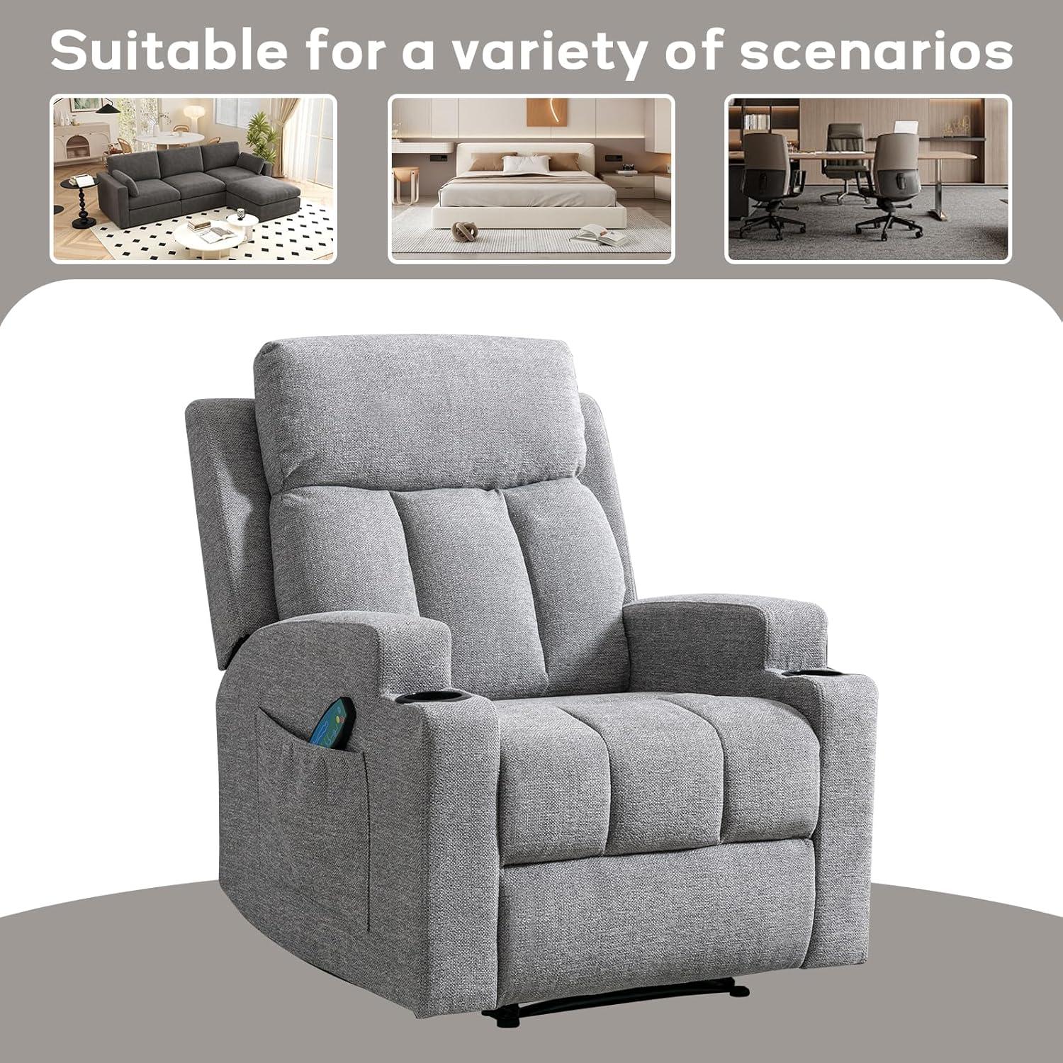CANMOV Manual Recliner Chair with Massage and Heat,Soft Fabric Recliner Chair with Overstuffed Armrest and Backrest, Manual Reclining Single Sofa with 2 Cup Holders, Side Pocket for Living Room,Grey