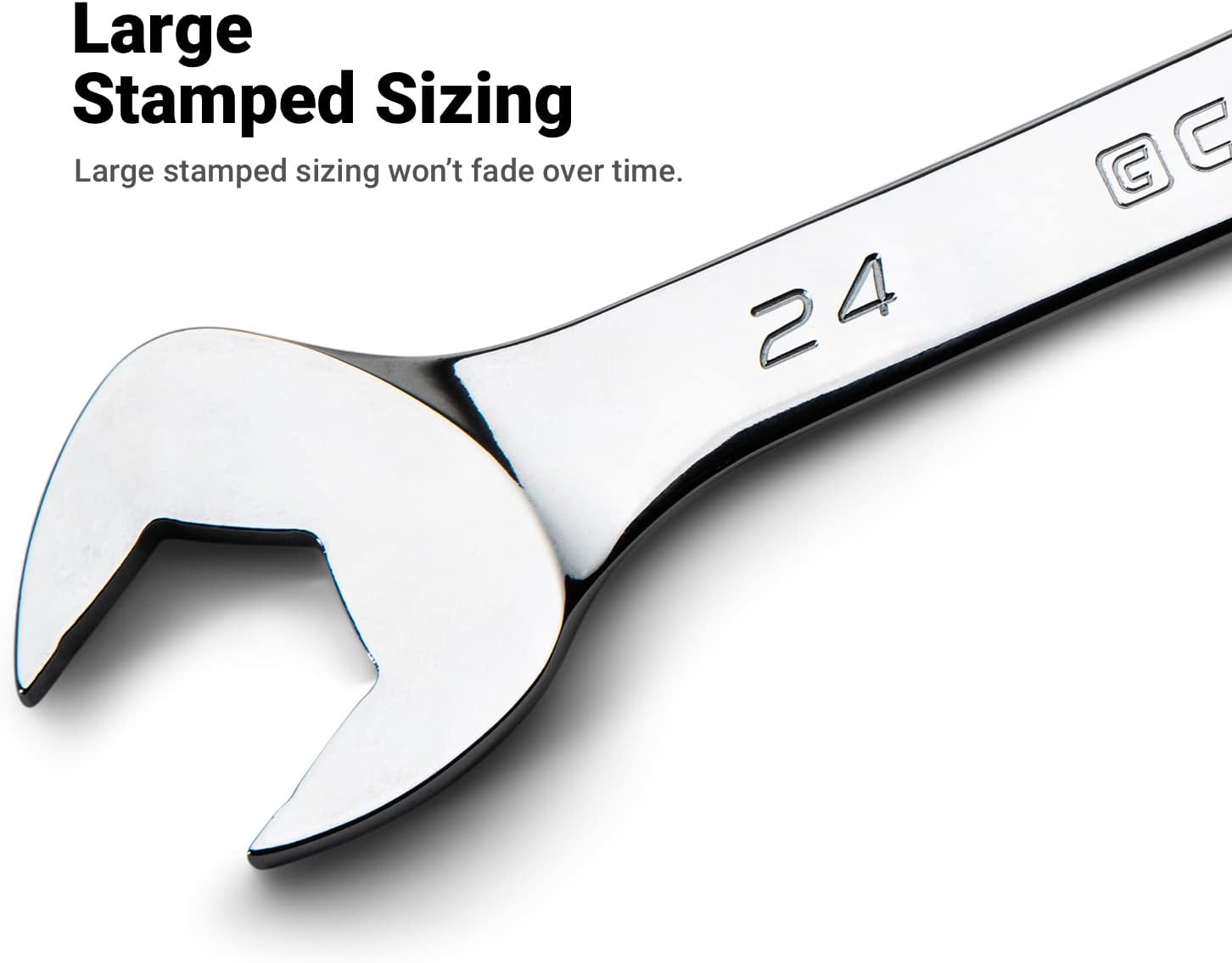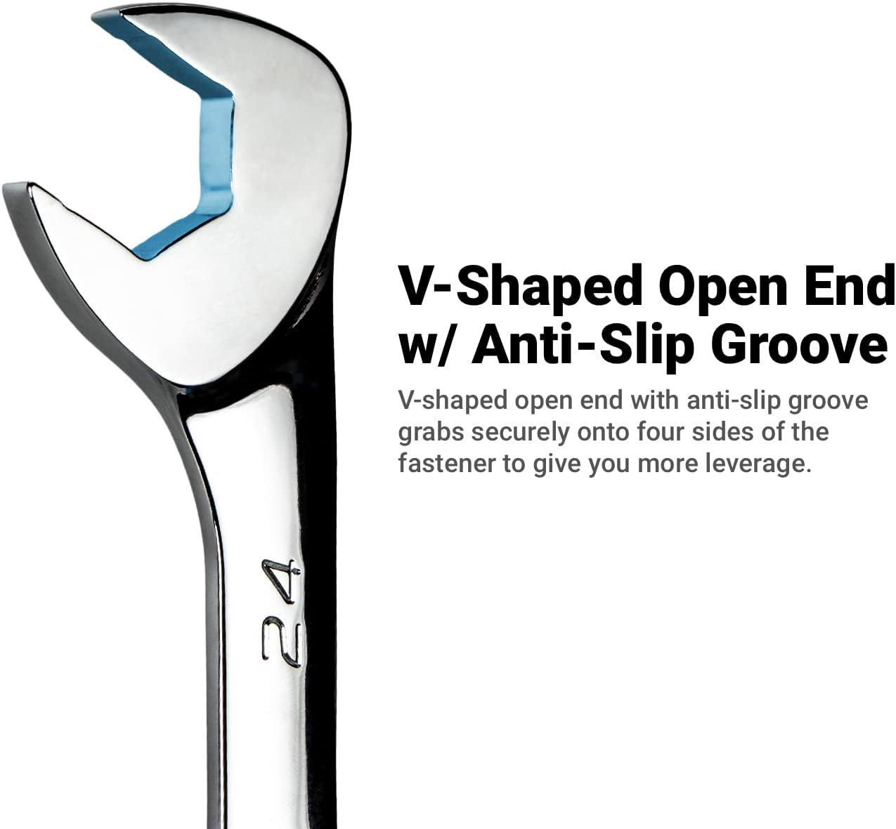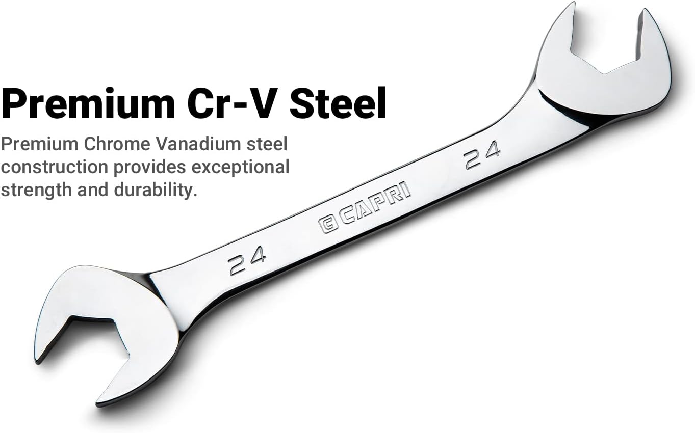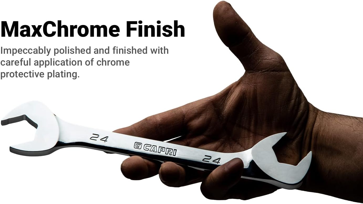 The Capri Tools 30° and 60° Angle Open End Wrenches let you access hard-to-reach areas where clearance is limited. 30° and 60° angle open ends with the same size opening on both ends, these wrenches give you maximum access to the fastener you want to reach. V-shaped open end with anti-slip groove grabs fasteners securely on four sides, giving you the leverage you need. Made with premium Chrome Vanadium steel and each wrench is impeccably polished and finished with careful application of our MaxChrome protective plating, ensuring durability and corrosion resistance.