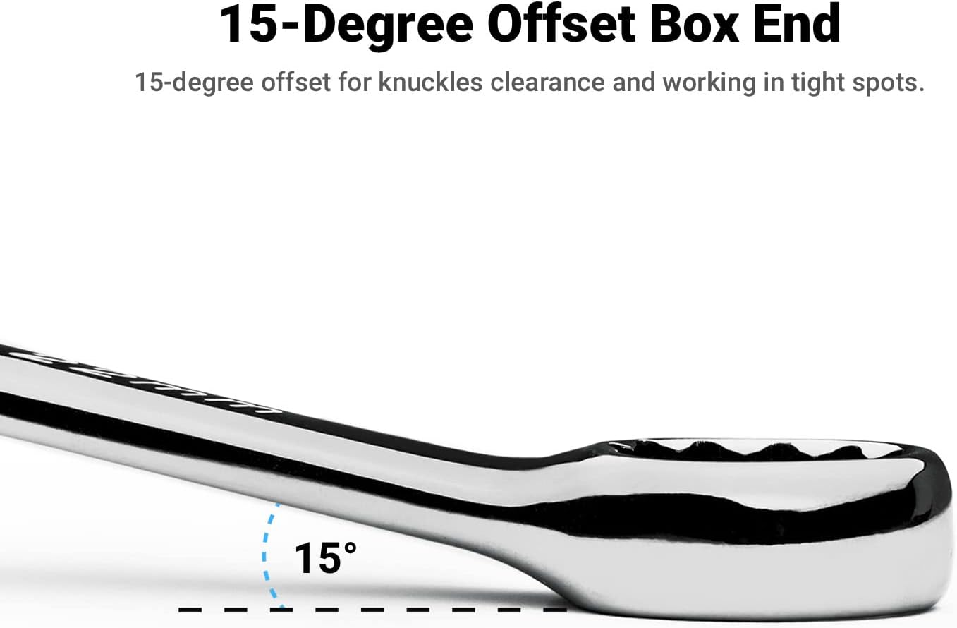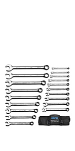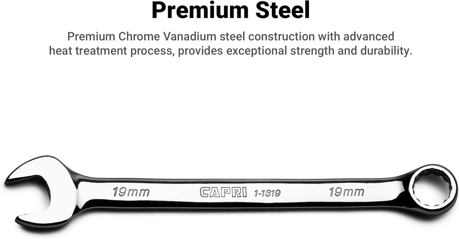 This Capri Tools Combination Wrench Set is made for serious professionals in high torque environment. We use premium Chrome Vanadium steel and a complete 10-step state of the art heat treatment process to make these combination wrenches. The result is a set of combination wrenches that does not break under high torque pressure. Each combination wrench underwent careful polishing and protective plating process to achieve its flawless polish. Constructed longer than standard-pattern wrenches, our wrenches give you more leverage and access to hard-to-reach areas. The 12-point box end has our WaveDrive design that transfers torque uniformly and prevents damaging and rounding of the bolt. 15-degree angle offset give you knuckle clearance and also helps you navigate in tight spots. A heavy-duty roll-up canvas pouch is included to carry these combination wrenches. Metric sizes include: 6, 7, 8, 9, 10, 11, 12, 13, 14, 15, 16, 17, 18, 19, 20, 21, 22, 23, 24 mm. The Capri Tools Combination Wrench Set meets ASME B107.100 standards.