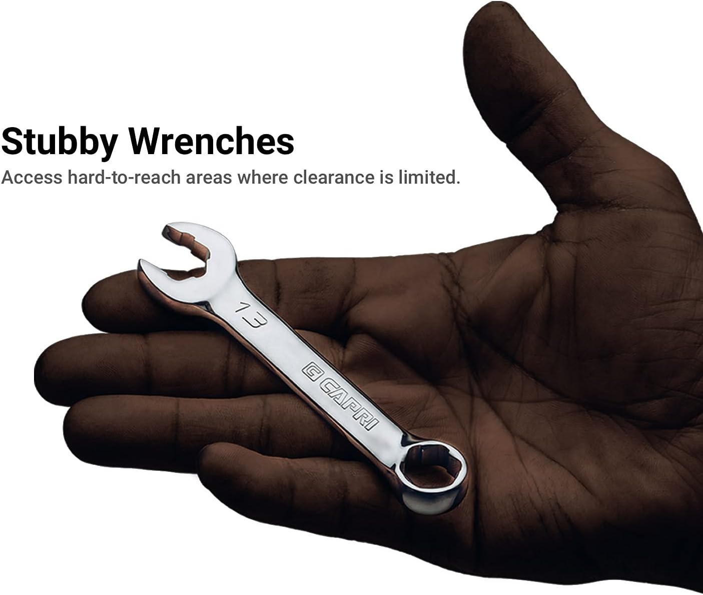 The Capri Tools WaveDrive Pro Combination Wrenches are a new generation of combination wrenches that lets you tackle bolts in virtually any condition. They feature WaveDrive Pro with a specialized geometry that gives you a powerful grip on bolts, even works as a bolt extractor on bolts that are up to 90% rounded off. WaveDrive Pro open end (3-point) and box end (6-point) give you a sure grip and satisfying turns on both unrounded and rounded bolts. WaveDrive Pro also prevents damaging and rounding of unrounded bolts. The stubby length handle lets you access hard-to-reach areas where clearance is limited. The box end is offset 15-degrees for knuckle clearance and working in tight spots. Made with premium Chrome Vanadium steel and each wrench is impeccably polished and finished with careful application of our MaxChrome protective plating, ensuring durability and corrosion resistance.