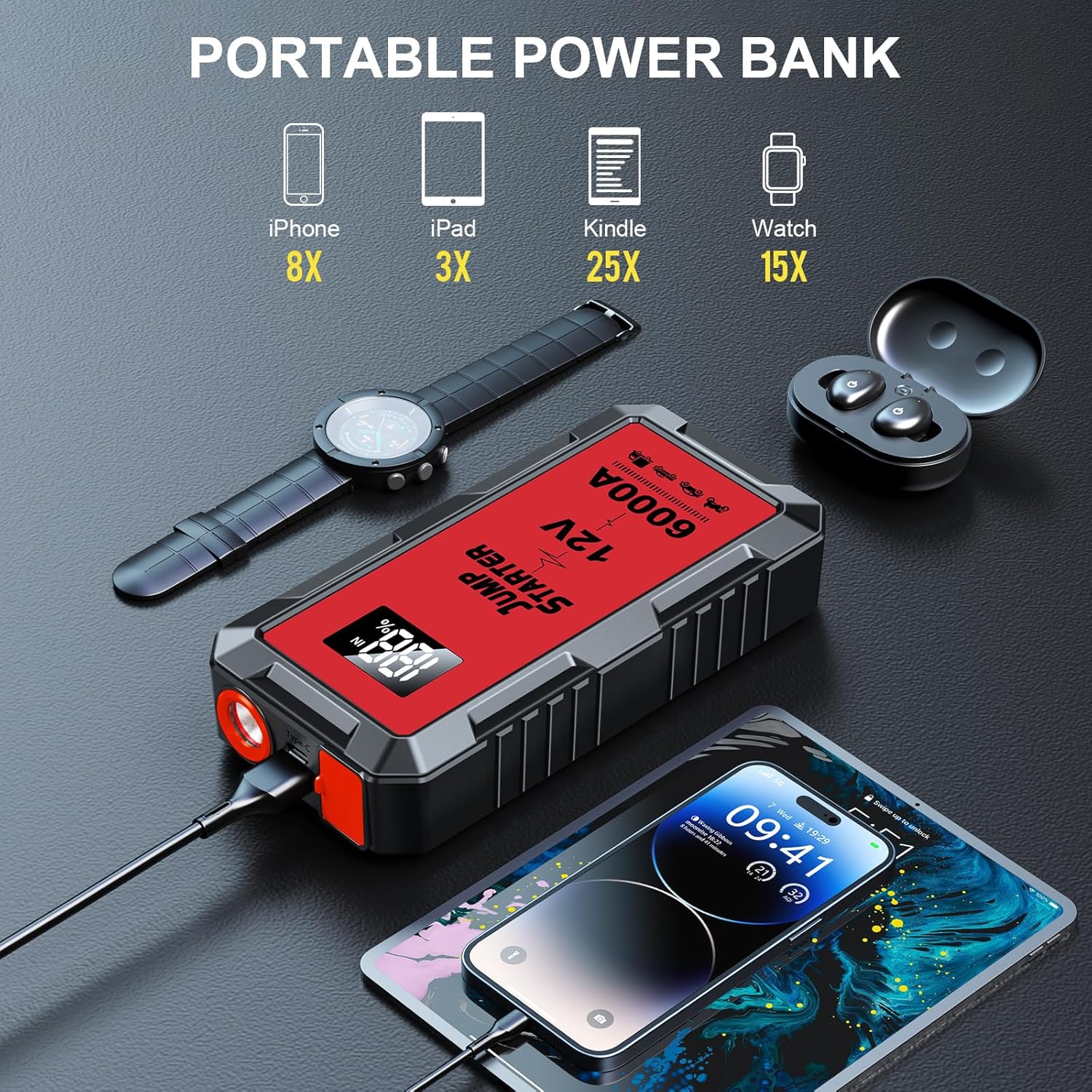 Car Jump Starter 6000A, 12V Jump Starter Battery Pack (All Gas,up to 10.0L Diesel Engine) Jumper Cables Portable Lithium Jump Box, USB Output and LED Light