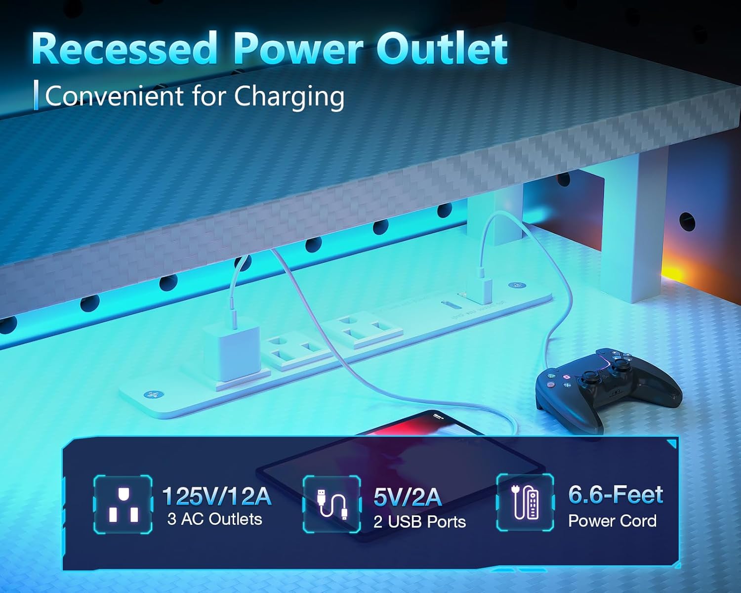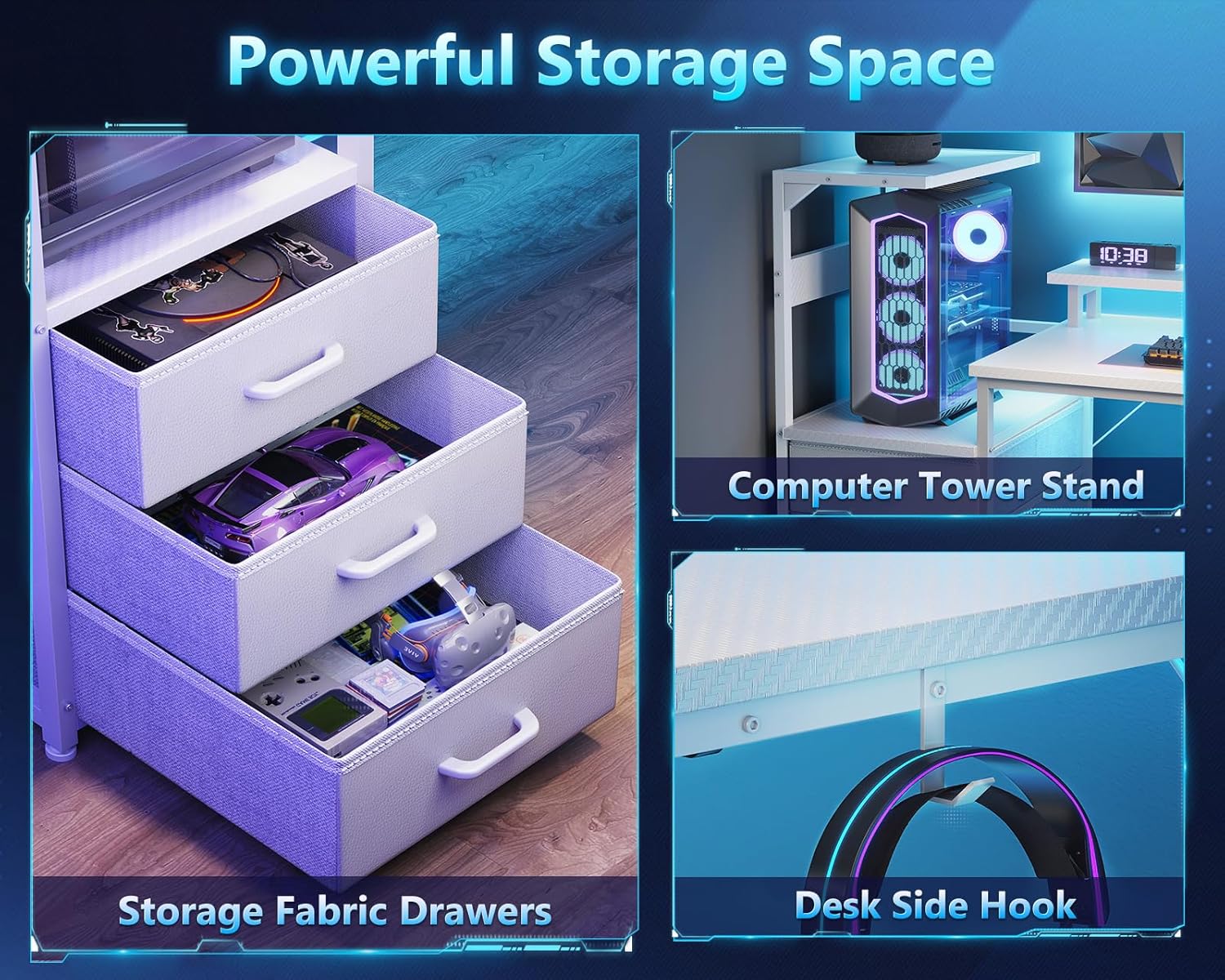 Casaottima 59 Inch Gaming Desk with USB Charging Ports & LED Light - Reversible Computer Desk with 3 Fabric Drawers, Monitor Stand, CPU Stand, and Side Hook, Modern Office Desk, White