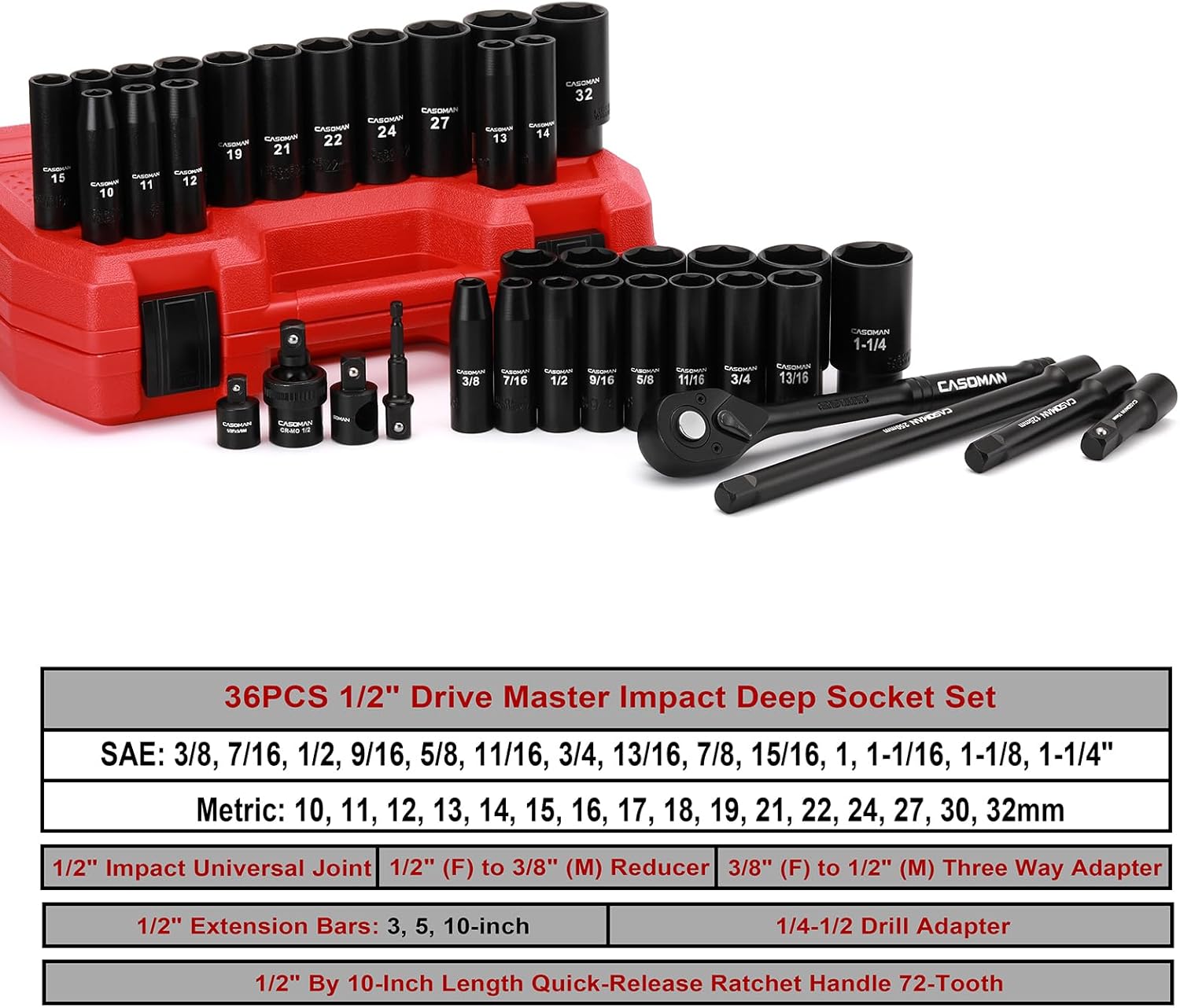 CASOMAN 1/2" Drive Master Impact Socket Set, 38 Piece Deep, Standard SAE (3/8" To 1-1/4") & Metric (10-32 mm) Sizes, Includes Extension Bar (3, 5, 10-inch), Adapters & Ratchet Handle, CR-V