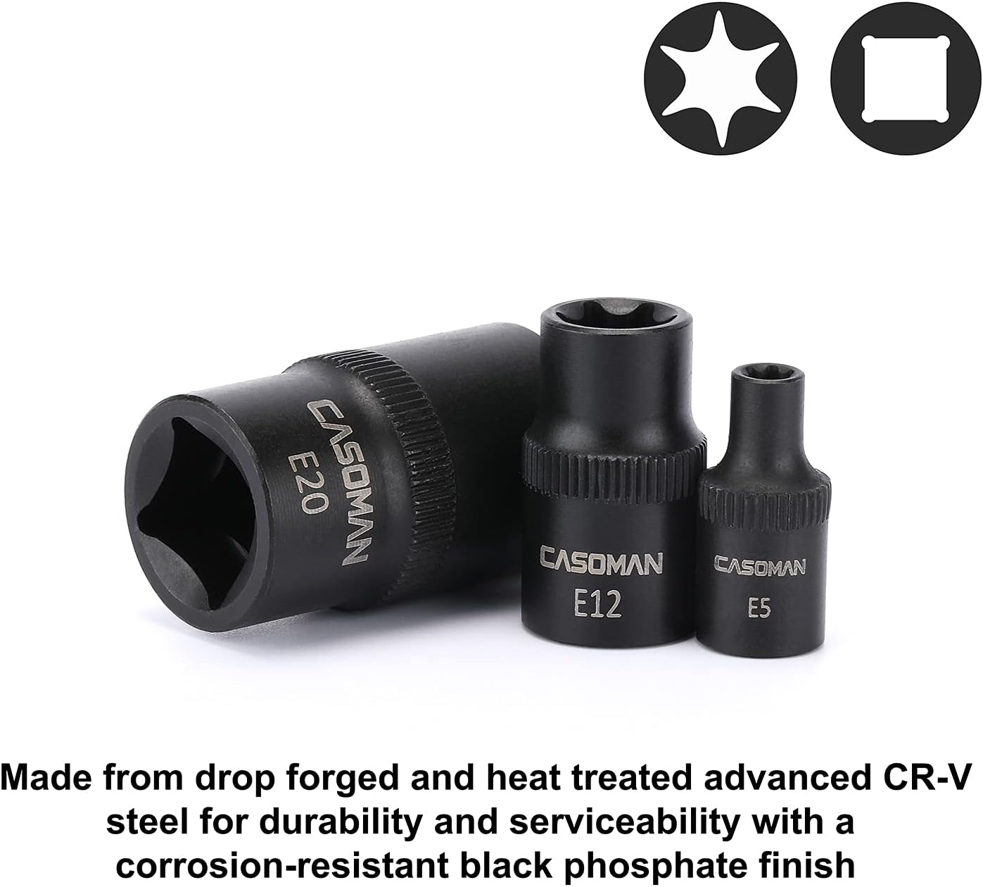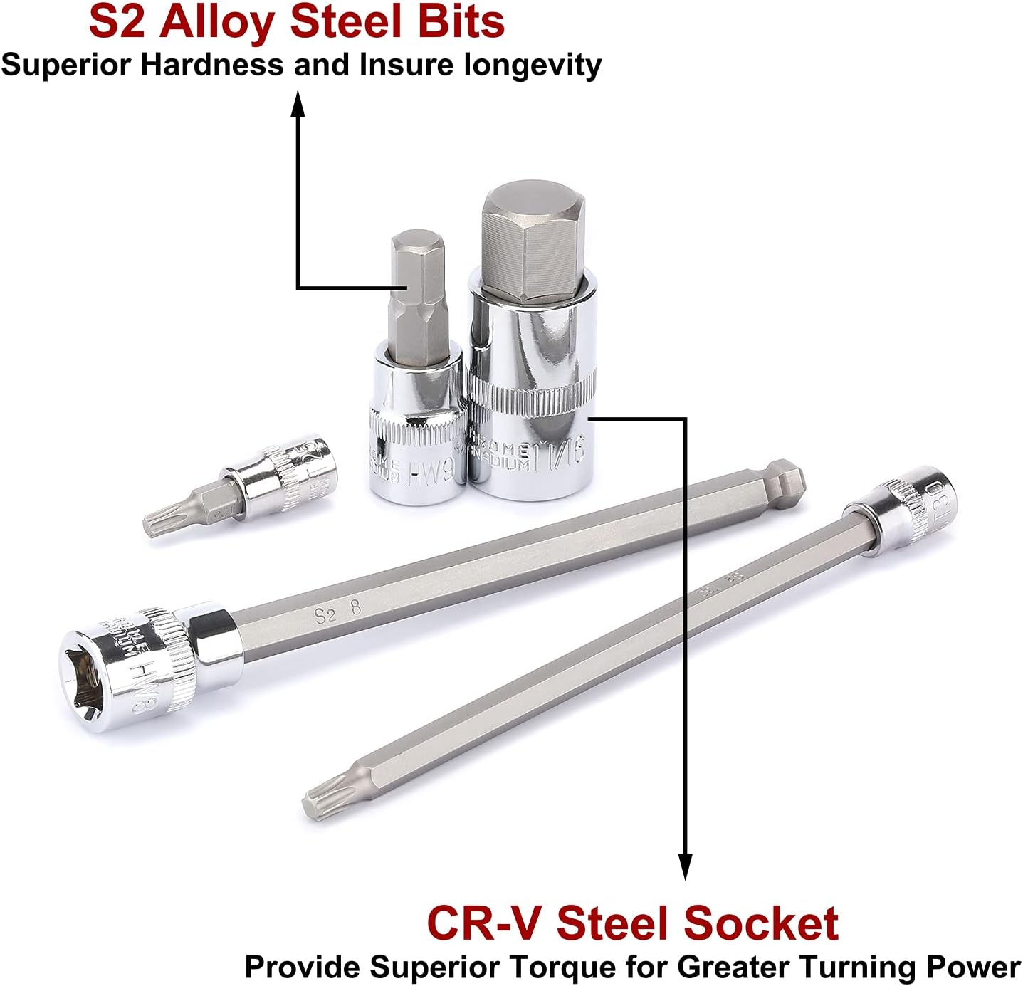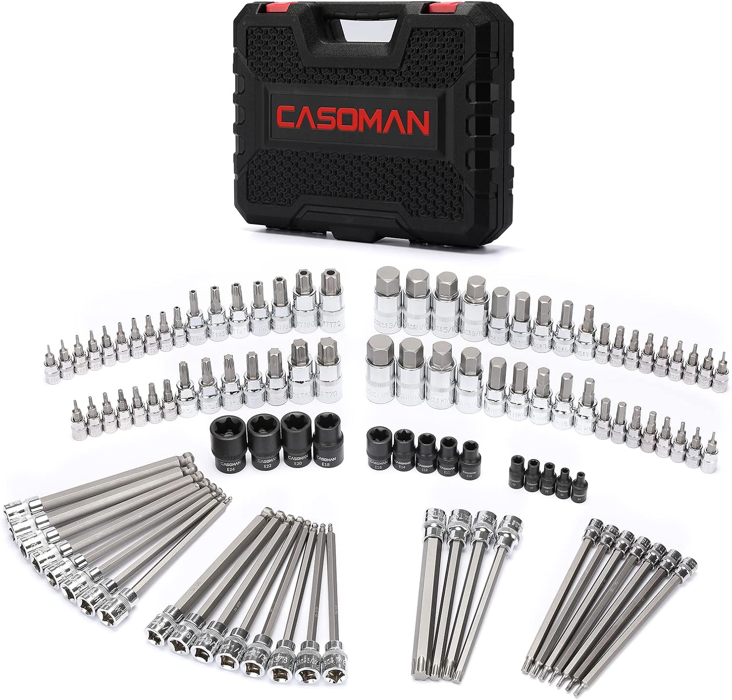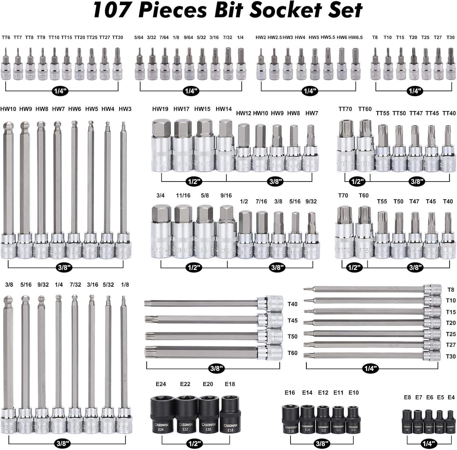 CASOMAN 107 Pieces Bit Socket Set, 1/4", 3/8" and 1/2" Drive, Torx/Extra Long Torx/Tamper Proof Torx/Hex/Ball End Hex, SAE/Metric, S2 Steel Bits