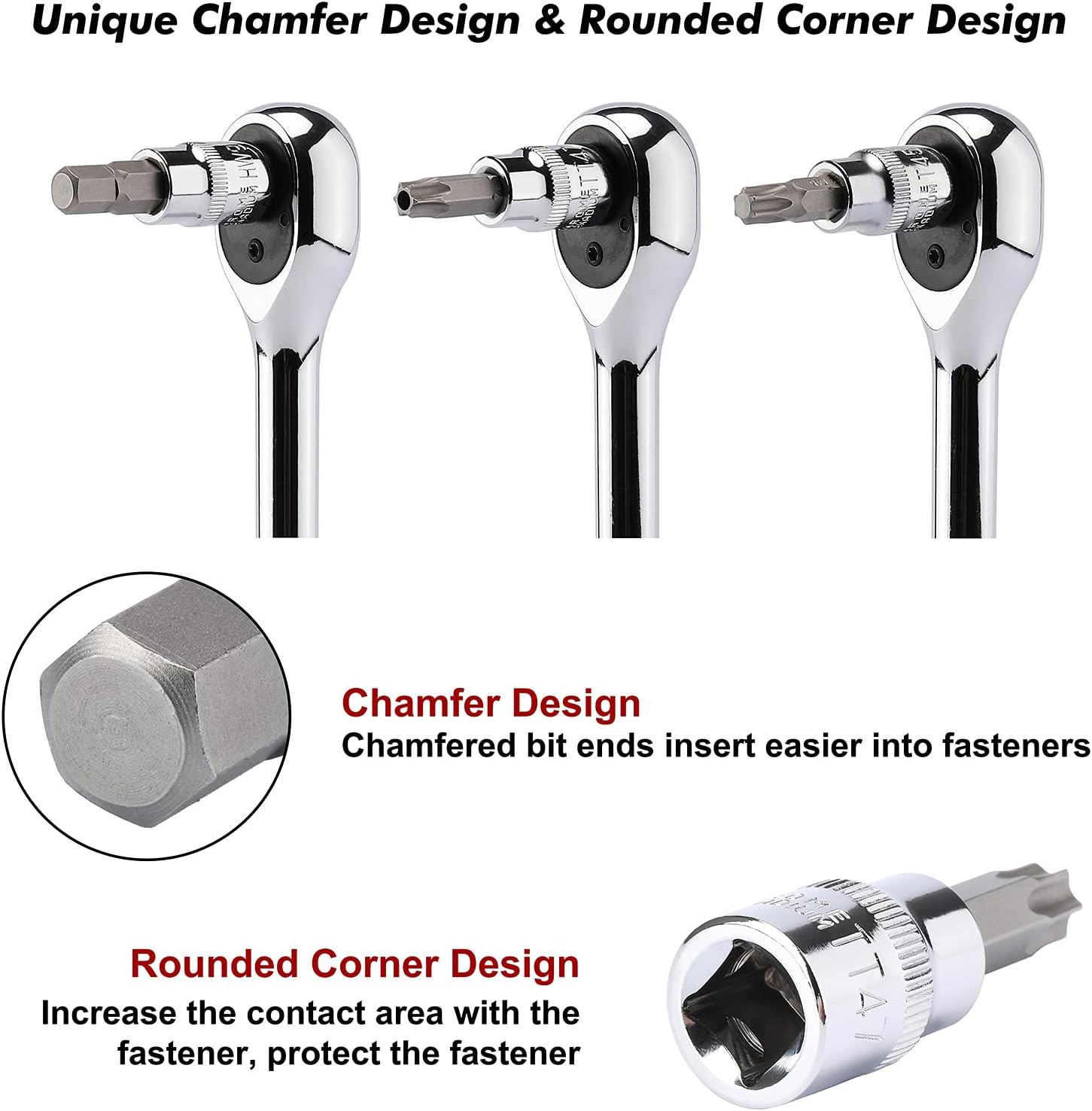 The CASOMAN 107 Pieces bit socket is made of S2 alloy steel, which is strong and has good toughness, not easy to break. The sockets are made from drop forged and heat treated advanced chrome vanadium steel for durability and serviceability with mirror chrome plated, and the E-Torx Sockets with manganese phosphate coating. Each bits head has a unique chamfering design, increases the contact area.