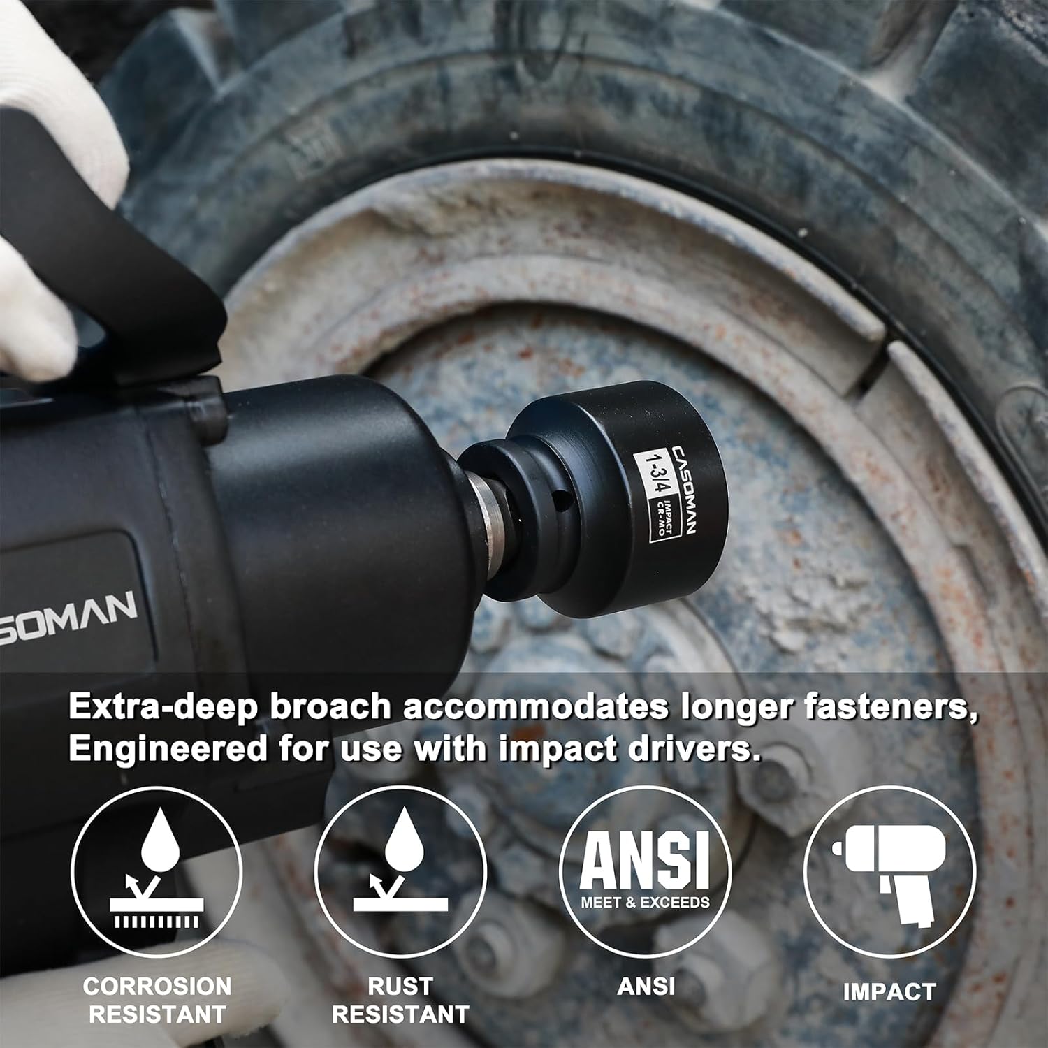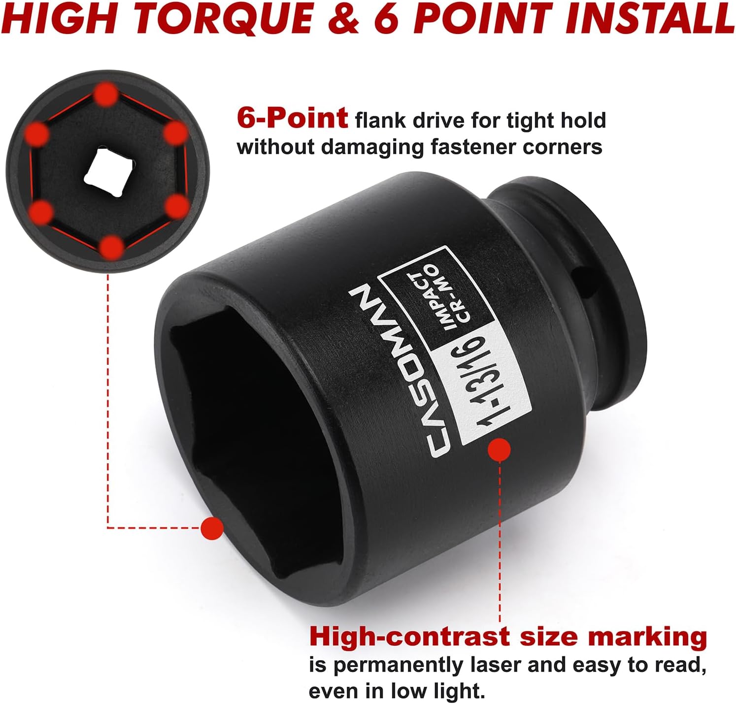 Manufactured from premium impact grade Chrome Molybdenum steel, construction with corrosion-resistant black phosphate finish for durability. 6-Point install, removal, repair to remove, install, and repair hub or axle nuts on your vehicle; Fits axle nuts on most american domestic and larger vehicles. High-contrast size marking is permanently laser and easy to read, even in low light.