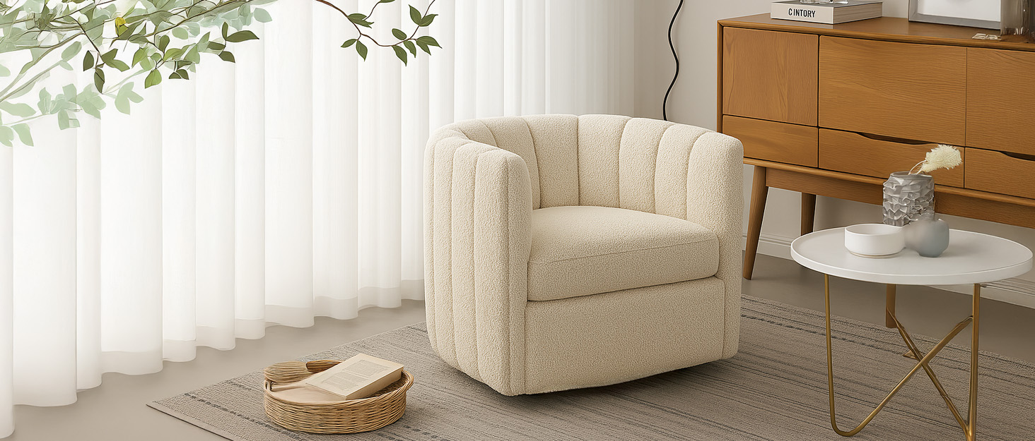 CHERS Rivet Mid-Century Modern Swivel Armchair, Channel-Tufted Faux Leather Accent Chair, 360-Degree Rotating Lounge Chair with Ergonomic Design for Living Room, Bedroom, Home Theater, Pewter
