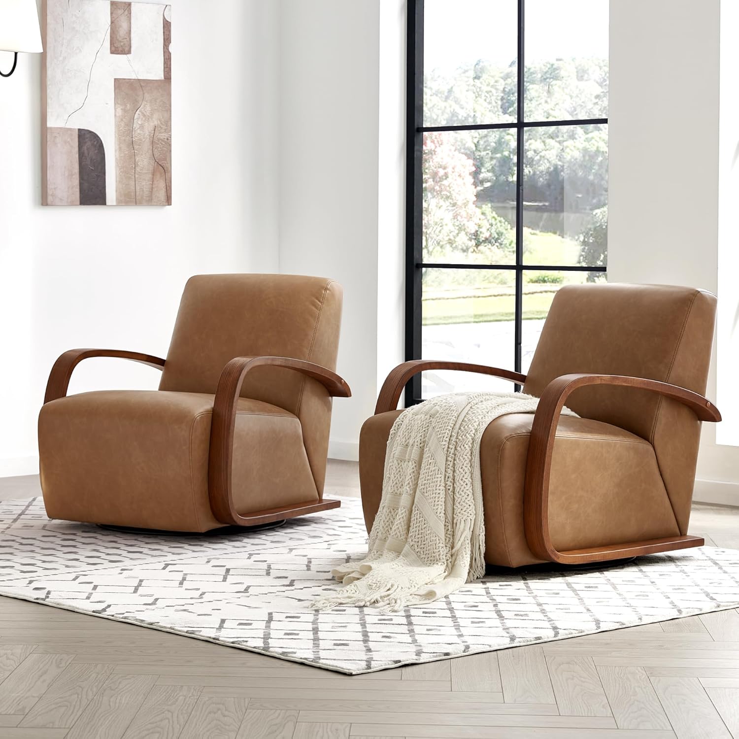 CHITA Swivel Accent Chair, Modern Arm Chair for Living Room, Cognac Brown in Faux Leather with Walnut Wood Arm