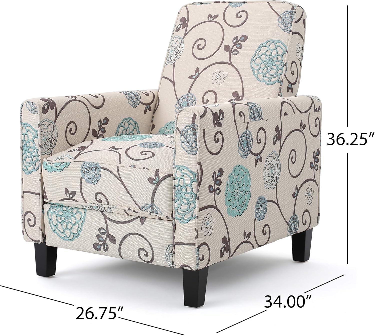 Having limited space in your living room does not mean you have to settle for inferior furniture. Our charming recliner club chair set offers impressive comfort while maximizing your living space with its petite design. Featuring piped edges, smooth upholstery, and sleek tapered legs, these recliners bring an atmosphere of refinement to any room. With an air of contemporary style, our recliner set offers an attractive upgrade for your home, allowing you to easily kick up your feet for a relaxing respite regardless of your space limitation. Includes: Two (2) Recliners Material: Fabric Fabric Composition: 100% Polyester Leg Material: Birch Color: Light Beige with Blue Floral Leg Finish: Dark Brown Assembly Required Dimensions: 34. 75 inches deep x 27. 00 inches wide x 36. 25 inches high Extended Dimensions: 60. 50 inches deep x 27. 00 inches wide x 27. 00 inches high Seat Dimensions: 22. 50 inches deep x 19. 75 inches wide x 18. 25 inches high Arm Height: 23. 00 inches.