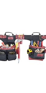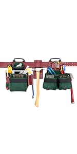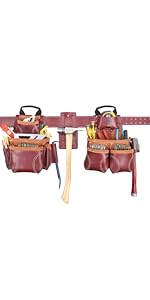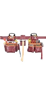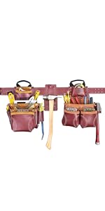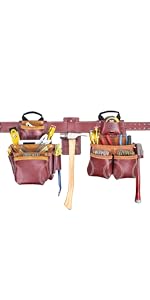 7 main reversed nail and tool pockets and 9 smaller pockets fit pliers, nail sets, pencils, knife, etc. Leather combination square and pry bar holders. Fits waist sizes 29" - 42".