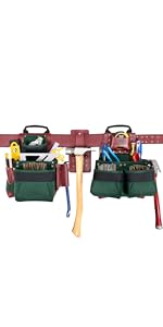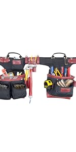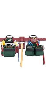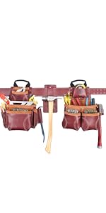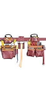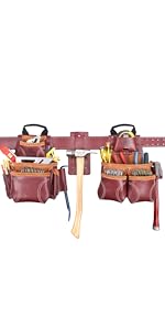 7 main reversed nail and tool pockets and 8 smaller pockets fit pliers, nail sets, pencils, knife, etc. Leather combination square and pry bar holders. Fits waist sizes 29" - 42".