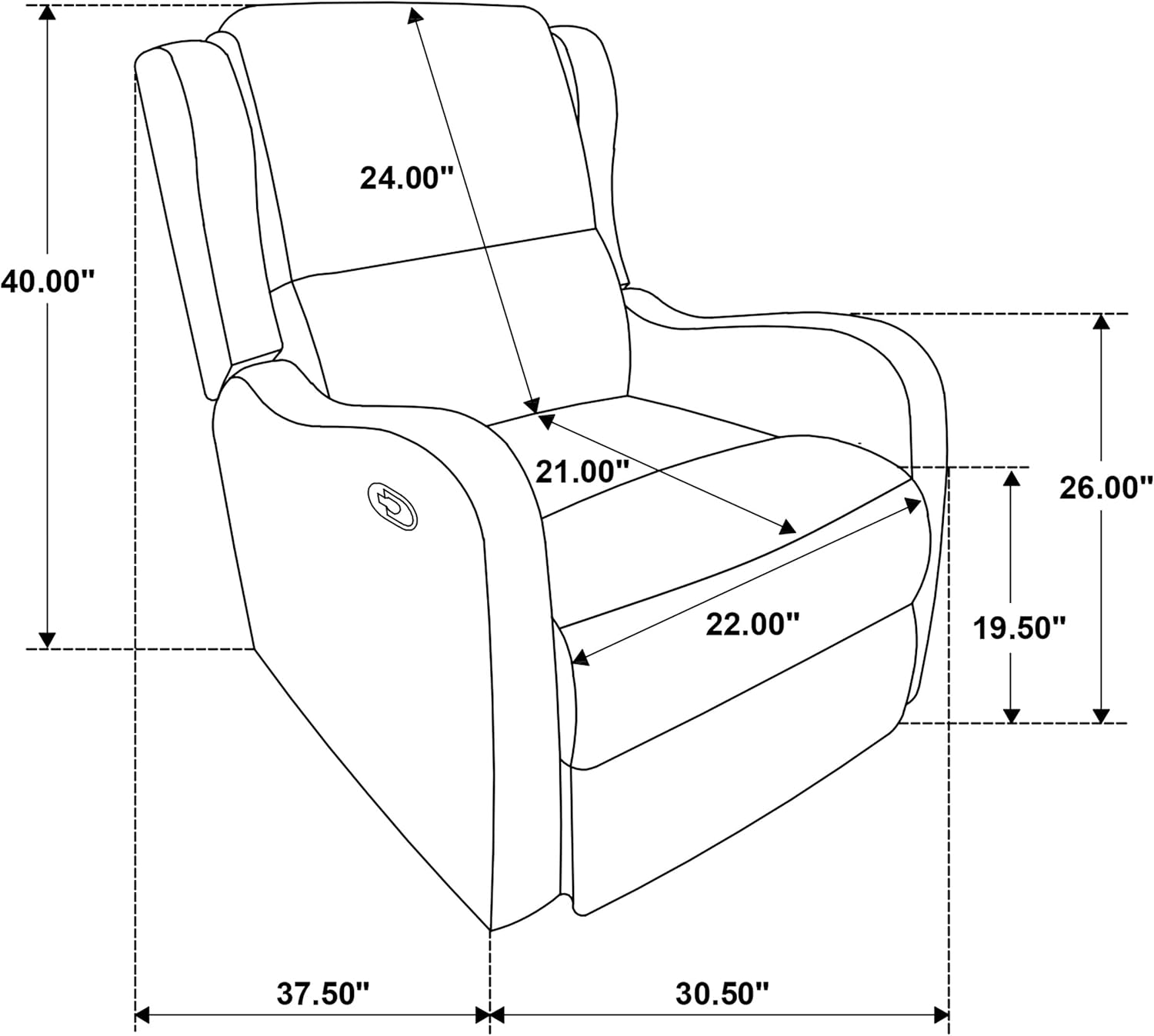 - Recliner Seat Dimensions: 19.25 inches high x 22.5 inches wide x 21.25 inches deep