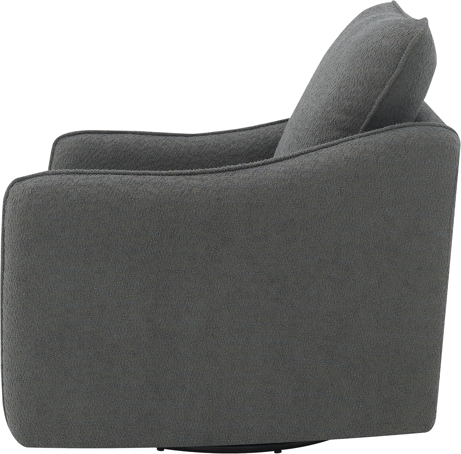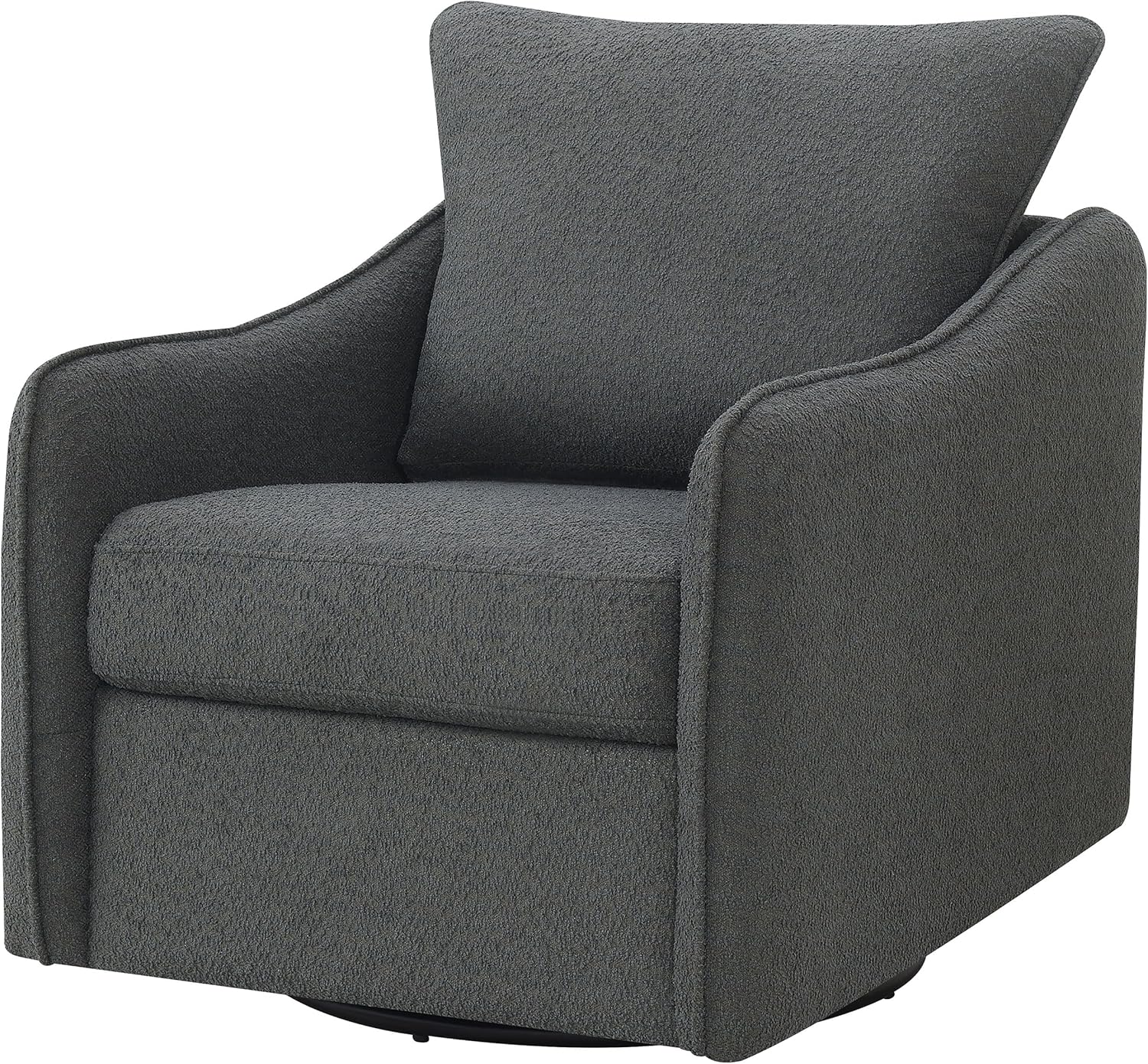Add modern comfort and sophistication to your space with this stylish charcoal accent chair. Featuring a 360-degree swivel base and sleek black legs, this chair is designed for smooth movement and contemporary elegance. The charcoal upholstery complements the sloped arms and padded back, offering both visual appeal and lasting comfort. With a cozy padded cushion and reversible back cushion, this accent chair with arms is the perfect addition to your living room or home furniture collection, providing versatility and style.