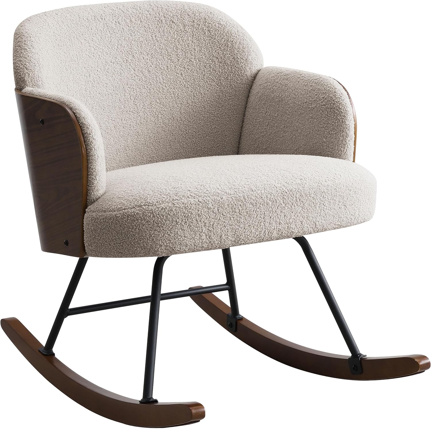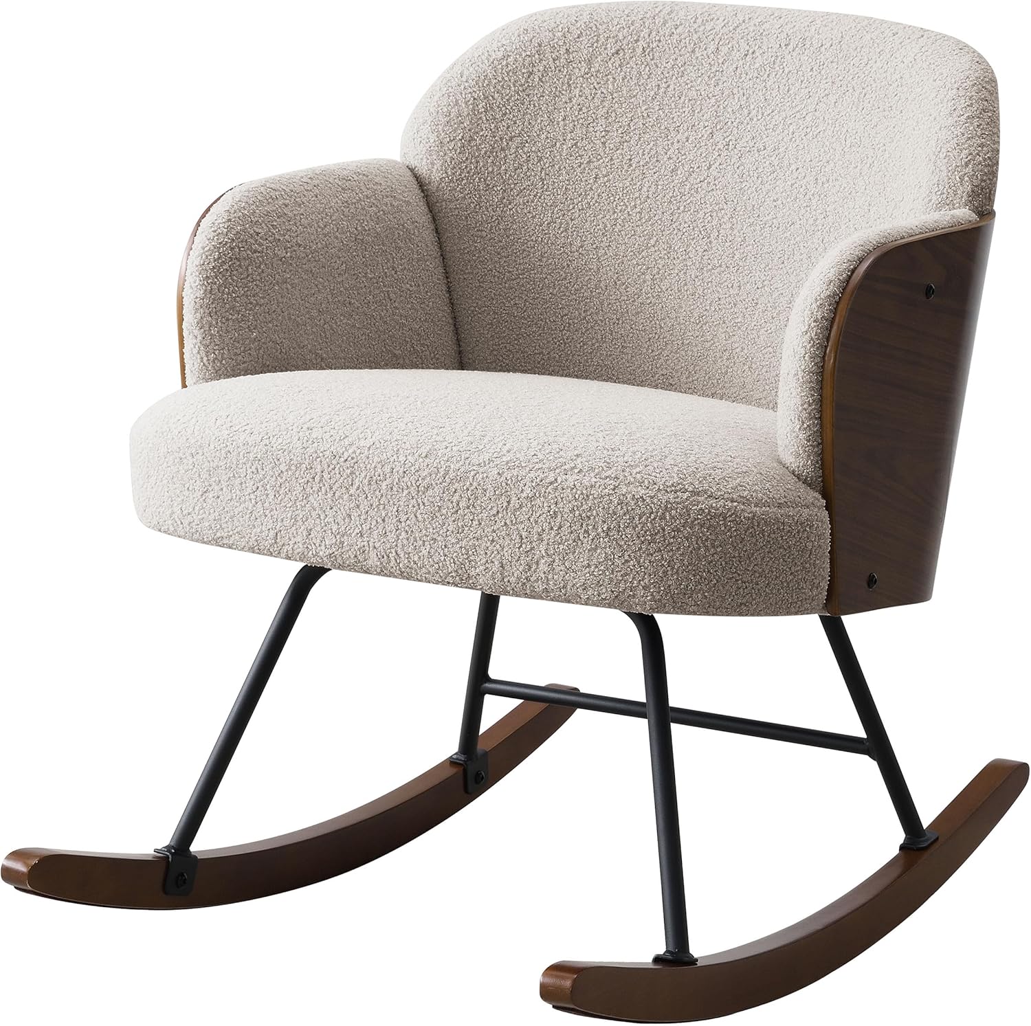 Bring comfort and style into your home with this upholstered rocking chair, designed with plush boucle upholstery and a supportive foam-filled seat for ultimate relaxation. Its sturdy walnut-finished frame and smooth curved wooden rockers add timeless charm, making it a standout piece among your living room furniture. Showcasing a sleek contemporary style paired with a warm beige finish and durable metal legs, this chair blends seamlessly into a variety of spaces. Crafted with a strong wood frame, it enhances your home furnishing collection while serving as a versatile piece for any inviting area.