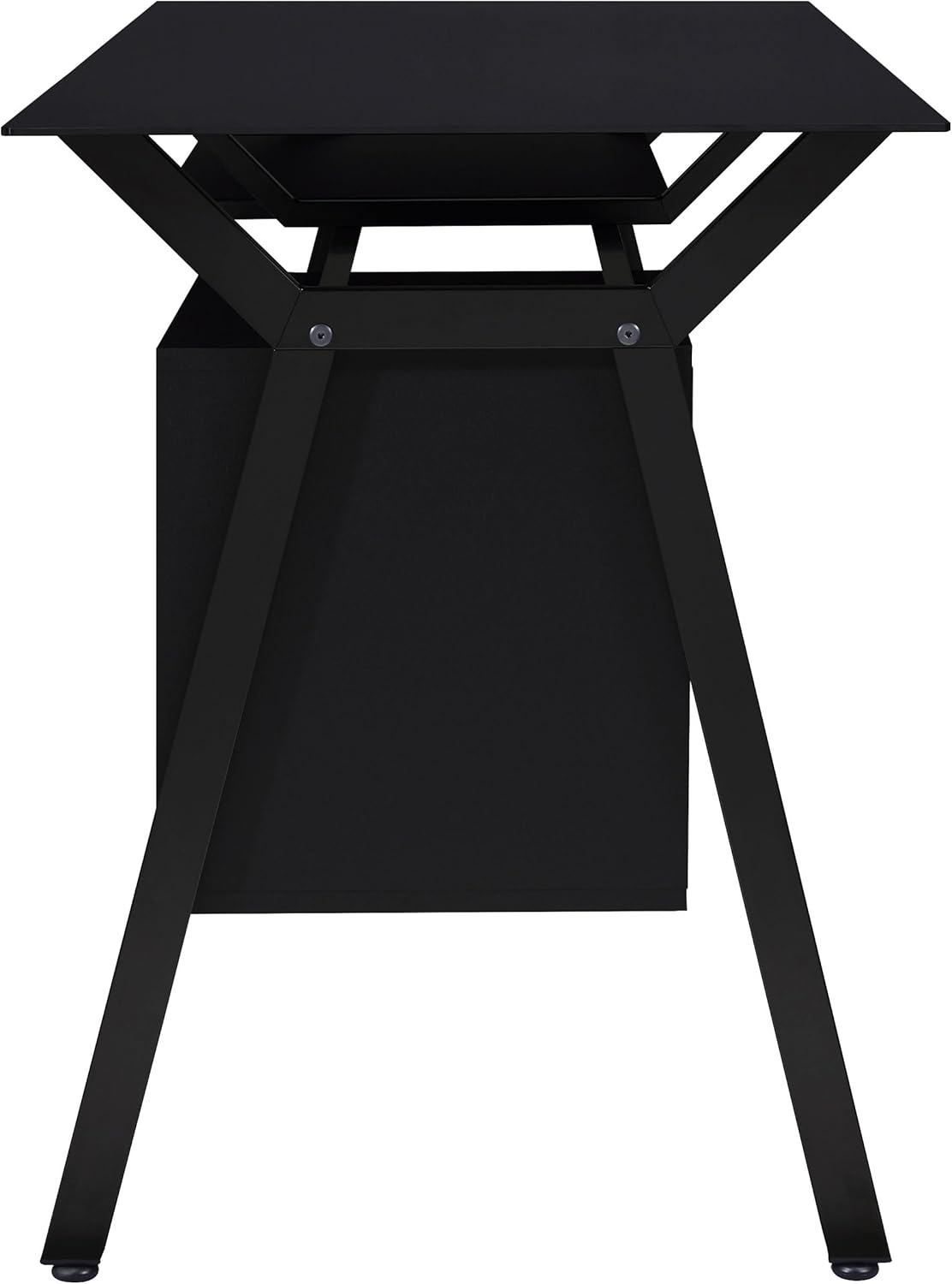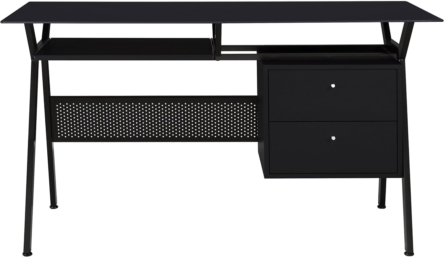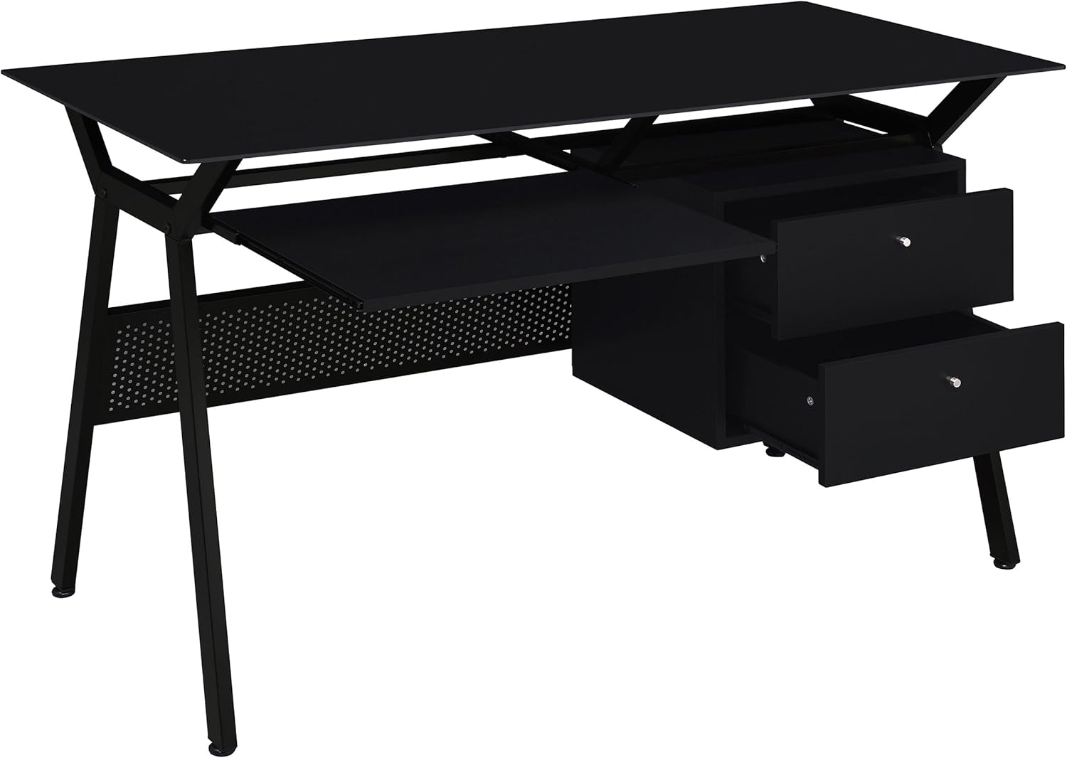 Perfectly suited for a modern home office, this contemporary style 55-inch computer desk combines sleek design with everyday functionality. Built with durable engineered wood and finished in a sophisticated black finish, it features a tempered glass top and metal frame for lasting support. Thoughtfully designed with a keyboard tray, metal extension glide, and smooth top, it provides seamless organization and a clutter-free workspace. The integrated 22-inch tray and spacious storage that includes 2 drawers make this computer desk with drawers and keyboard tray a refined centerpiece for any home office furniture setup.
