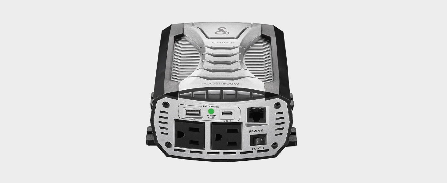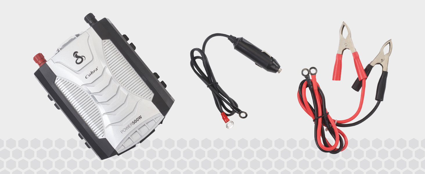Harness the power of your vehicle's DC battery! Power up your next pregame, add the convenience of home appliances on your next road trip, or even turn your car into a mobile office. The Cobra POWER 500 Watt Modified Sine Wave Power Inverter turns your car battery into usable A/C household current. It is ideal for entertainment devices & small appliances, as well as travelers, campers, RV enthusiasts, or for when a power outage occurs. Count on Cobra for power where you need it. Includes 16" #12 AWG power cable, 16" 12V accessory cable, and quick-start guide.