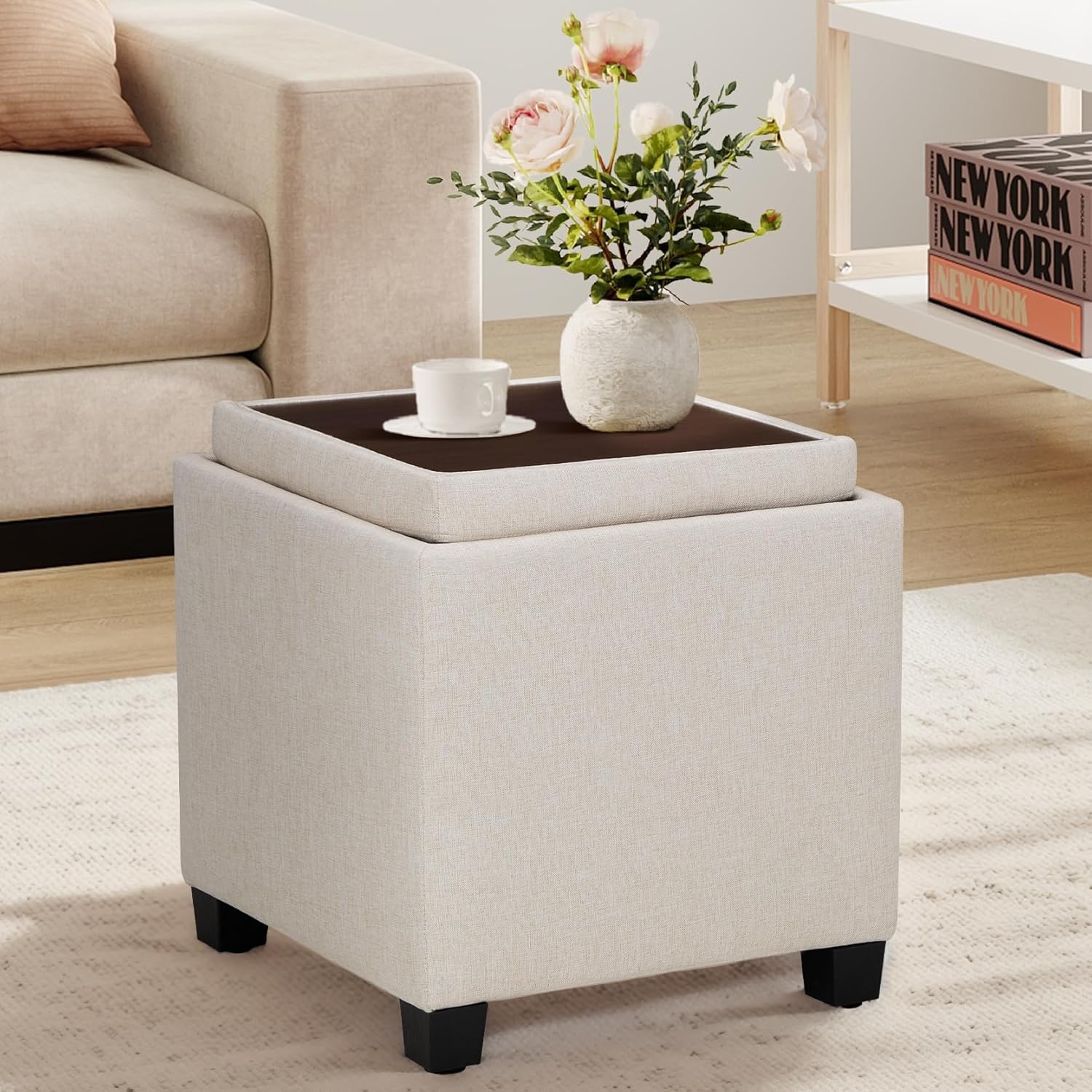 COLAMY Fabric Square Storage Ottoman with Reversible Tray Lid – Multi-Functional Footrest, Hidden Storage, Sturdy & Stylish Small Coffee Table for Living Room, Bedroom, or Entryway(Beige)