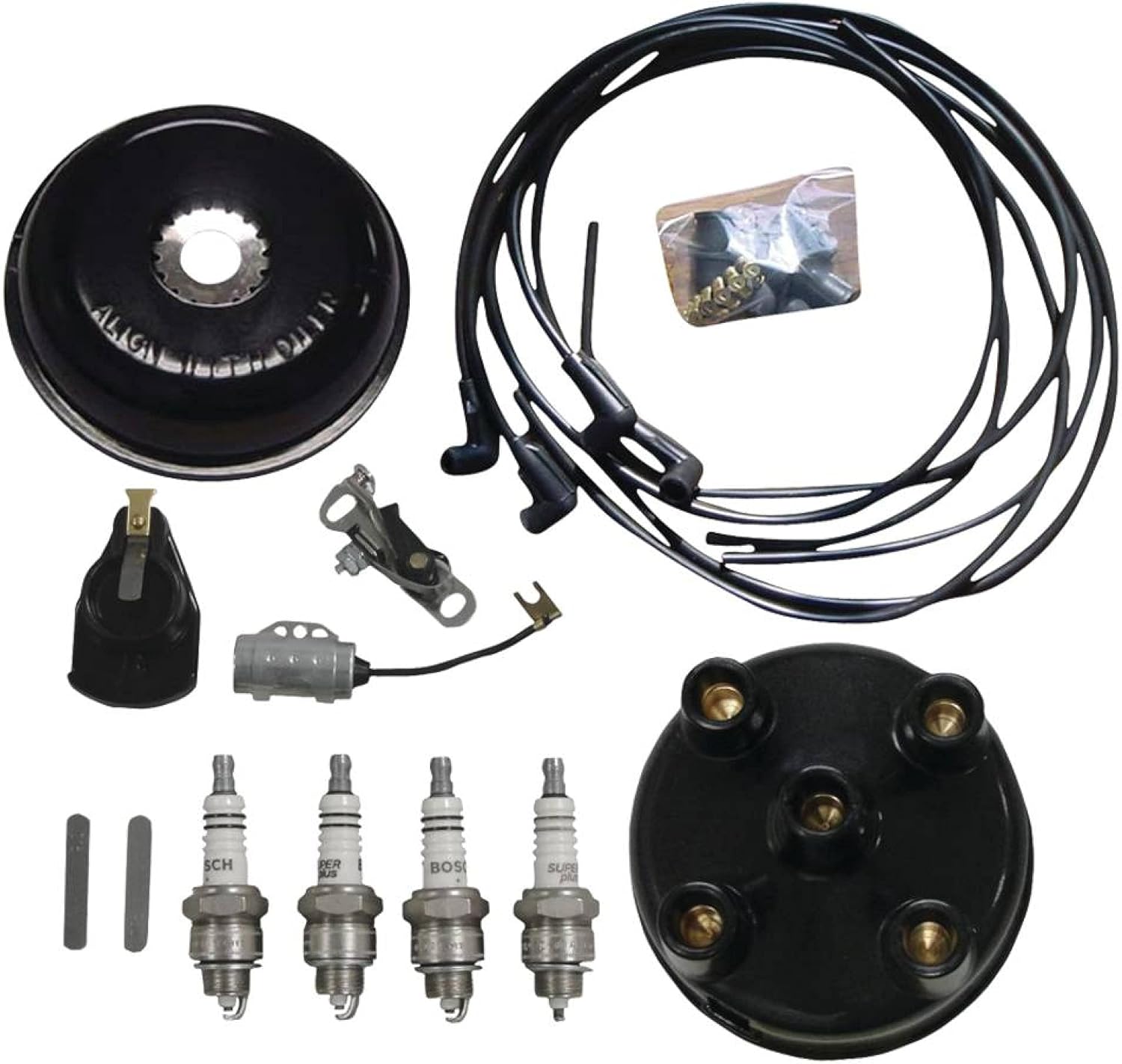 For 4 cylinder models w/side mount distributor 1953-64Kit Includes point set, condenser, rotor button, 4 Bosch spark plugs, adjustment gauges, dust cover, distributor cap and wire set.