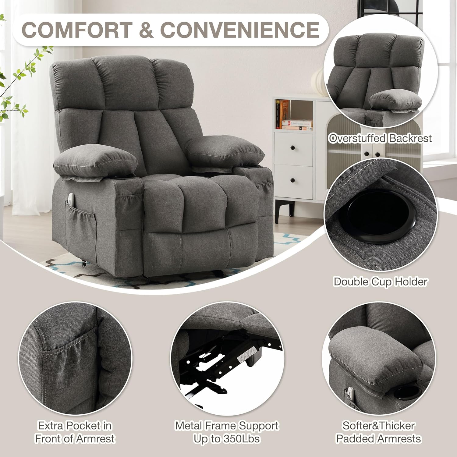 Rocker Massage Recliner Chair with Heat and Vibration Ergonomic Rocking Lounge Chair for Living Room Comfy Overstuffed Recliner with 4 Side Pockets,2 Cup Holders, USB Charge Port, Grey