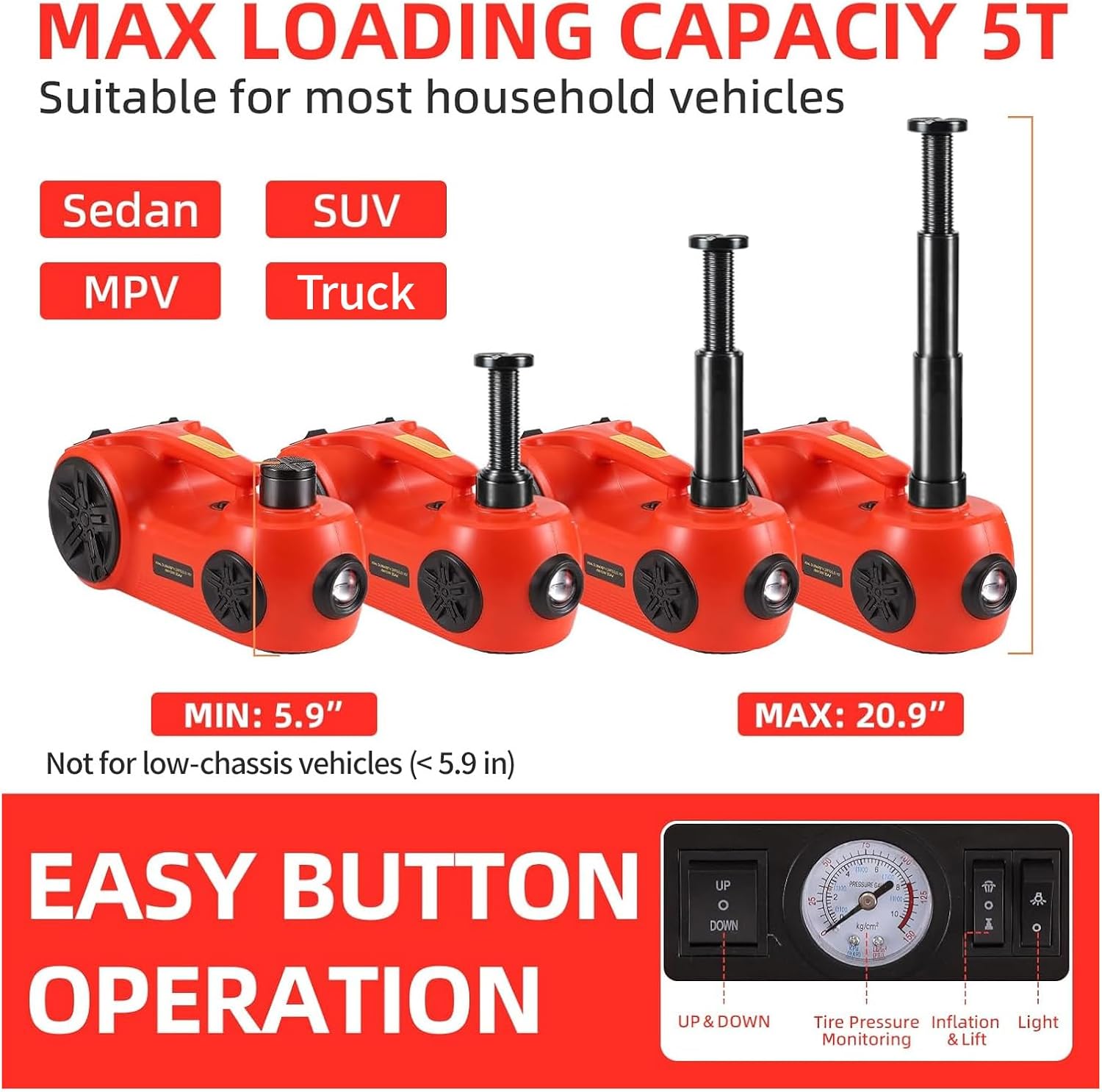 ROGTZ Upgraded Electric Hydraulic Car Jack Kit 5 Ton 12V Portable Lift Range 20.9 Inch with Tire Inflator Pump for SUV Sedan Truck Repair Floor Jack for Tire Change with LED Light Jack Only