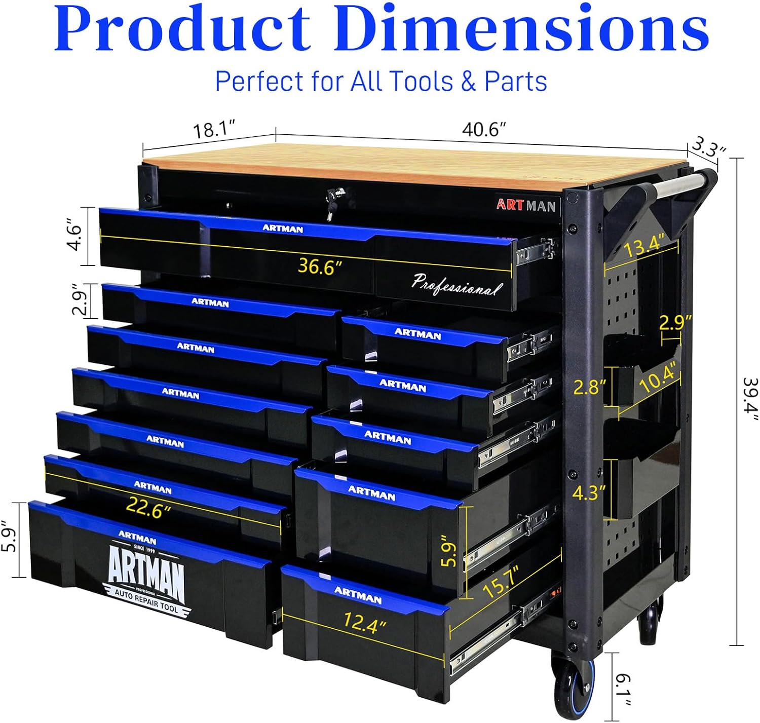 Rolling Tool Chest on Wheels, Heavy Duty Metal Tool Cabinet Chest with 12 Drawers, Wooden Workbench Top, Large Tool Cart for Warehouse, Garage, Workshop, Repair Shop, Tool Organizer Chest
