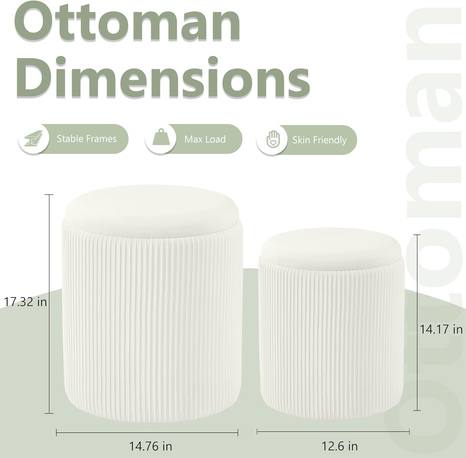Round Ottoman with Storage Set of 2,Vanity Stool with Storage for Bedroom, Ottoman Coffee Table,Small Velvet Foot Stool for Living Room, White