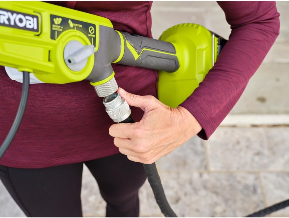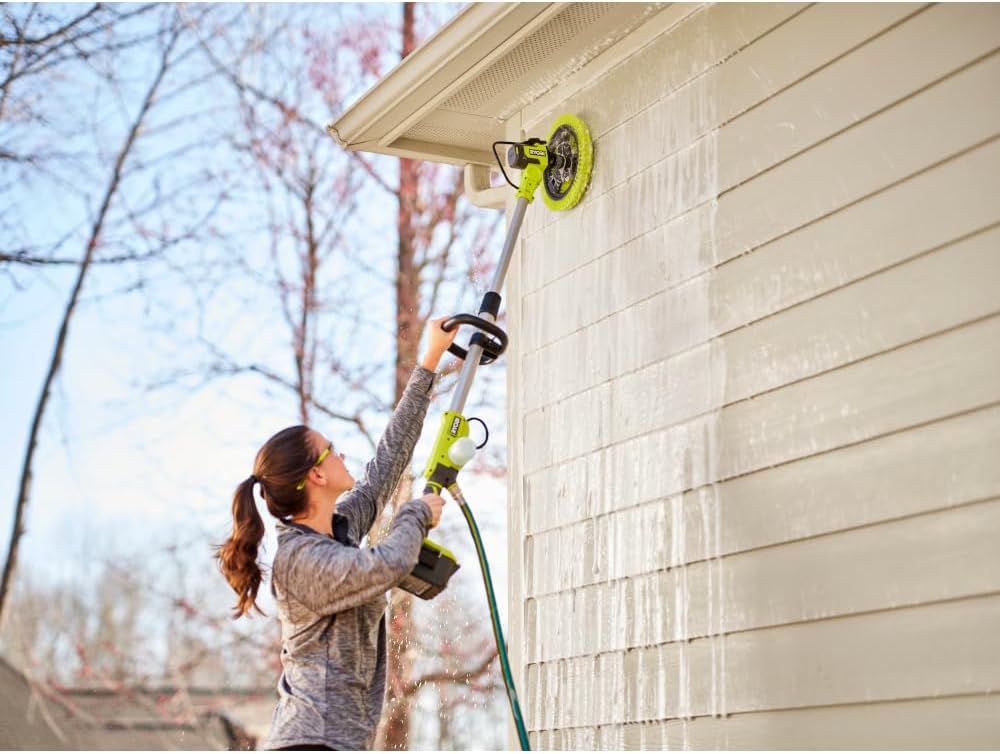 Enhance your RYOBI 18V ONE+ System with the 18V Soap Dispensing Telescoping Scrubber. Pick up this motorized scrubber and leave the sponges in the garage along with the backache that comes along with traditional cleaning methods. The cordless portability and lightweight design is perfect for cleaning on the go. The convenience of the 18V Soap Dispensing Telescoping Scrubber is having the power to do it all with cordless freedom; spray the included RYOBI Soap Solution, turn on the scrubber and let it do the work. This improved telescoping scrubber gives an effortless cleaning experience with soap and water dispensing technology. It is compatible with over 25 Hex Shank and Triangle Connector accessories – ranging from plush microfiber to abrasive bristles (sold separately). The included 6 in. Medium Bristle Brush is ideal for cleaning tile, fiberglass, siding, and more. The 6 position pivoting head and 51 in. telescoping pole allows cleaning in hard to reach areas. Clean with confidence knowing the scrubber’s battery enclosure is IPX7 Water Resistance Rated, meaning this tool can be submerged in up to 3 feet of water for 30 minutes. Best of all, it is part of the RYOBI 18V ONE+ System