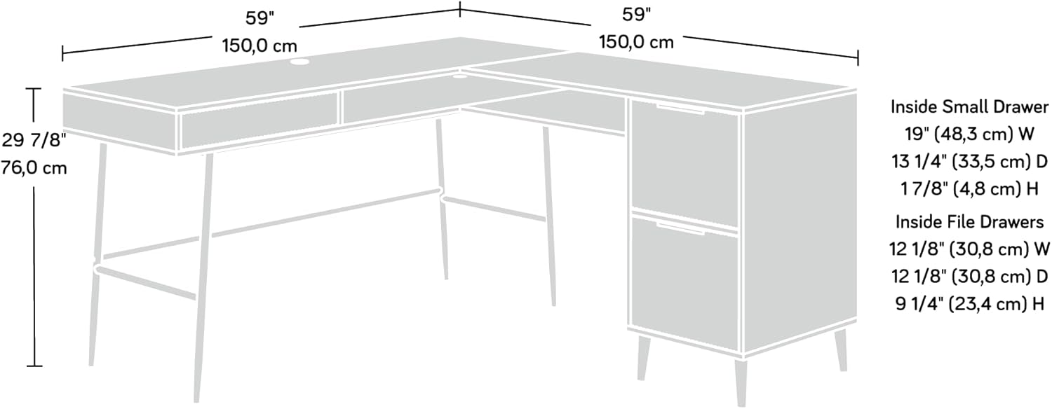 For a simple, yet unique desk solution that packs a big punch, look no further than the L-shaped desk from the Ambleside® collection. This L-shaped home office desk features a spacious top surface with enough area for your laptop, lamp, office supplies and a photo of your loved ones. Desktop grommet holes channel electrical cords to help keep the surface clutter-free. For convenience, this modern L-shaped desk features two drawers with full extension slides that hold letter-size hanging files. An additional smaller drawer also has full extension slides and stores office supplies close at hand. All three drawers include a geometric, fluted design on the fronts. The center open storage area gives this desk with cubby storage a place for storing a laptop, books, binders, or maybe a calendar. This L-shaped desk with drawers is finished on all sides for versatile placement in any room. Place it in the middle of the room or in a corner setting –it will look great from every angle. Finished in Serene Walnut™ with black accents and spindle legs, this L-shaped desk is the easy choice for a distinct home office desk.