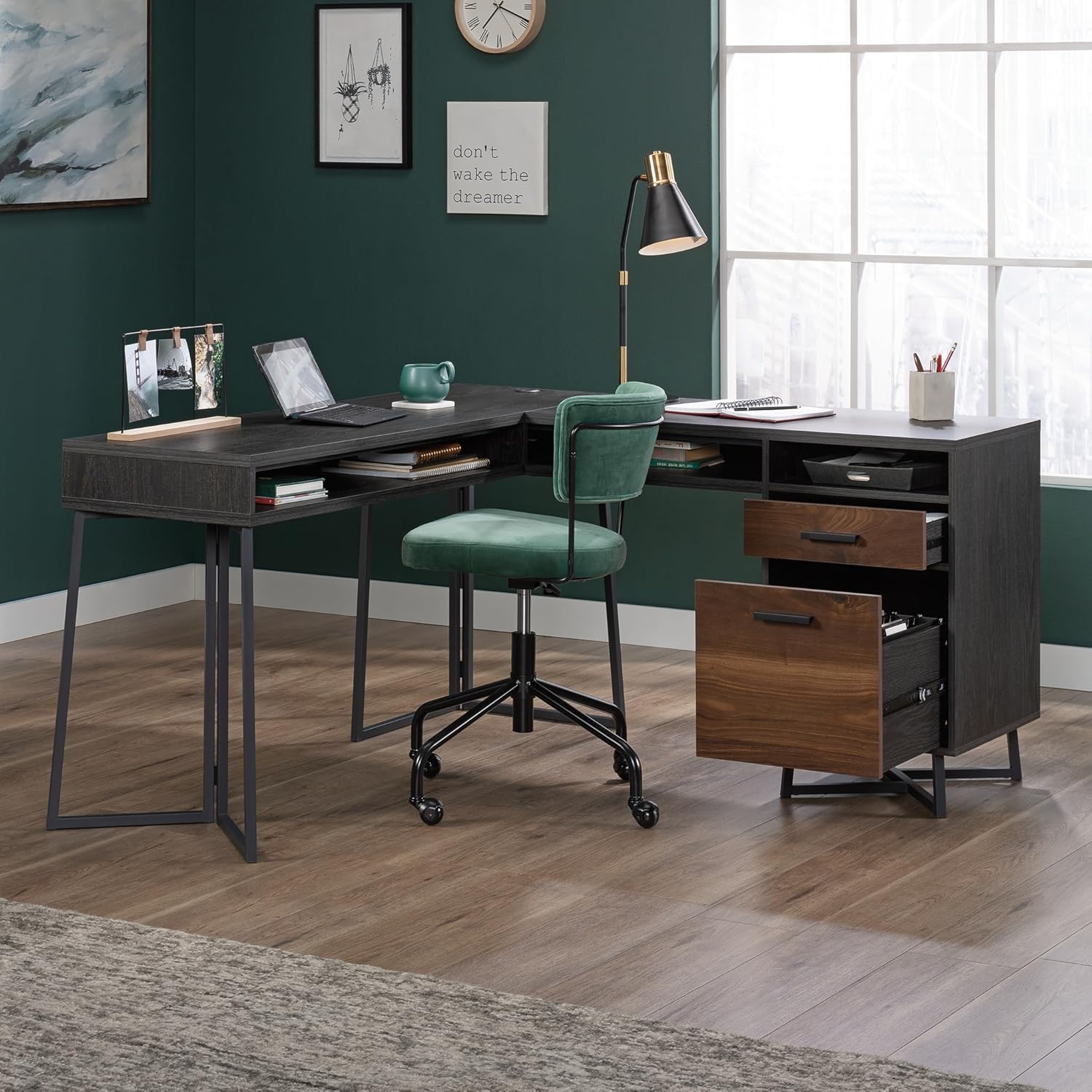 For an L-shaped desk with some flair, the Canton Lane L-shaped computer desk with storage has you covered. With a durable 1" thick top, this computer desk is durable and easy assemble. This desk features two drawers with full extension slides to hold various home office supplies: your chargers, extra notepads, and more. The lower drawer of this L-shaped computer desk holds letter-size hanging files, keeping your important files organized and easy to find. This computer desk with storage features cubbyhole areas under the top surface for your laptop, planner, sticky notes, and other items you want to have close at hand. A cord management system featuring two desktop grommets keeps your computer desk with drawers free of cord clutter. Finished on all sides for versatile placement, this L-shaped computer desk also features a powder coated metal base for durability. As an add-on, this office desk accommodates optional Hidden Wireless Qi Charger by Eggtronics 425905 (sold separately – visit sauder.com for more information). Finished in Brew Oak with Grand Walnut accents, this L-desk adds the perfect amount of storage and style to your home office.