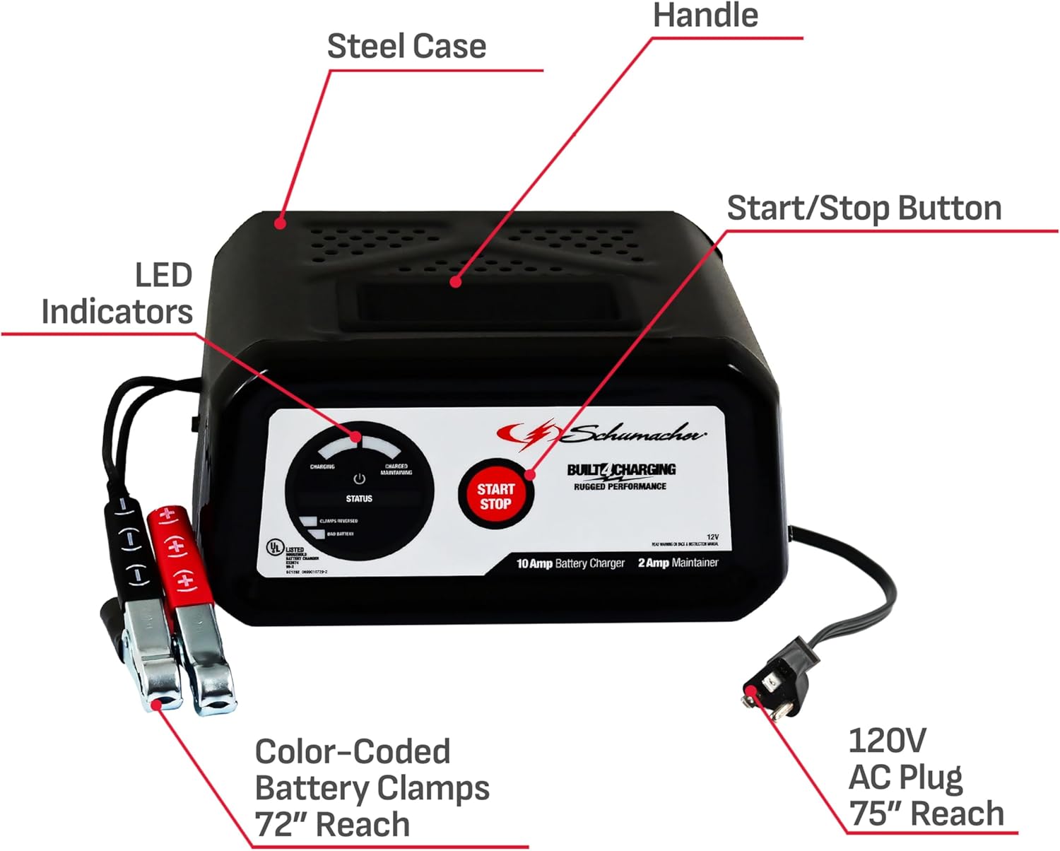 Schumacher Electric 10A Car Battery Charger and Maintainer, 3-in-1 Solution, for 12V Power Sport, Automotive, and Marine Batteries, SC1282