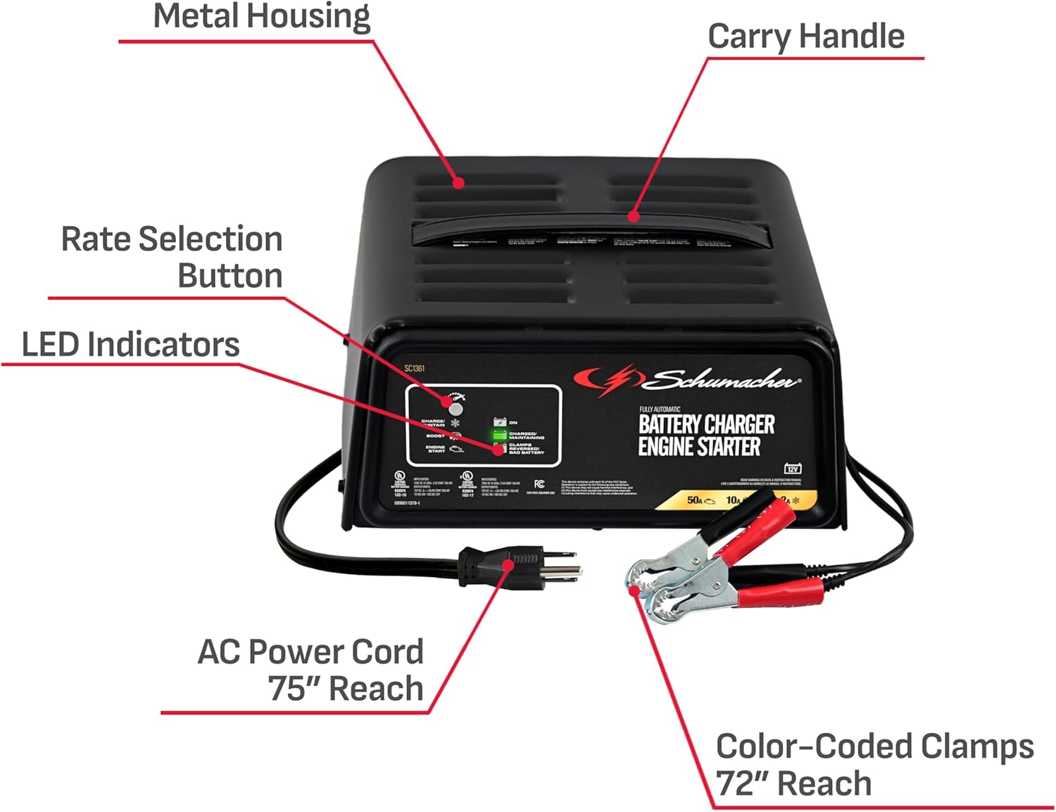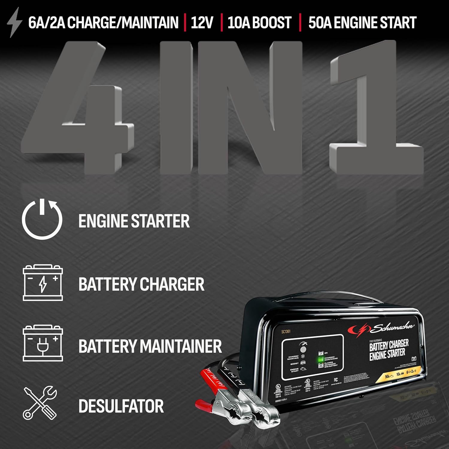 Schumacher Electric 6A Car Battery Charger and 50A Engine Starter, 4-in-1 Solution, Maintainer, 10A Boost, for 12V Power Sport, Automotive, and Marine Batteries, SC1361