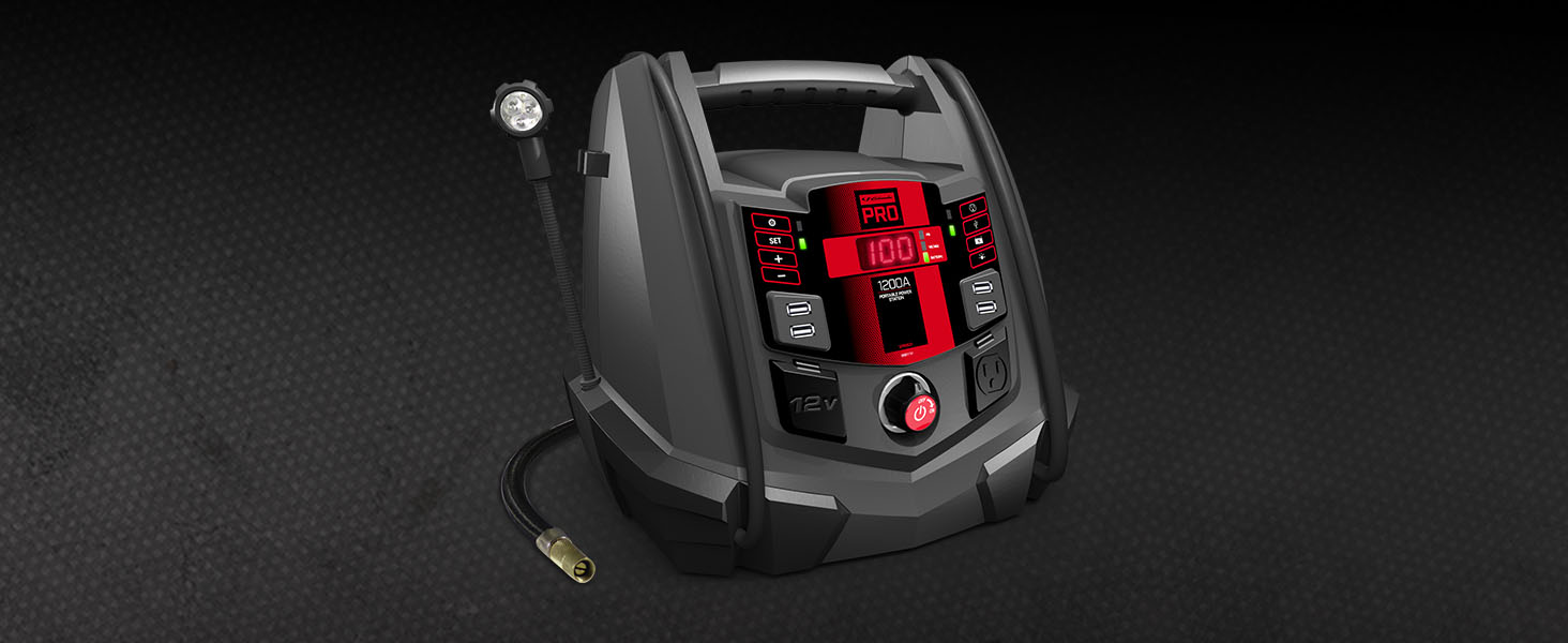 En español (ES): Prepárese para cualquier emergencia con la fuente de alimentación portátil 5 en 1 y arrancador de 1200 amperios a 12 voltios Schumacher Pro SPR1631. Diseñado para ofrecer versatilidad y confiabilidad, esta solución todo en uno está pensada para hacer frente de manera sencilla a una gran variedad de situaciones. Con 1200 amperios pico de potencia de arranque, el modelo SPR1631 es capaz de arrancar motores de gasolina de hasta 8.0L o motores diésel de hasta 6.0L, lo que lo hace perfecto para aplicaciones de trabajo pesado. Además, funciona como una fuente de alimentación portátil, ideal para emergencias, excursiones, acampadas y mucho más. Equipado con un inversor incorporado de 200 vatios continuos/400 vatios pico, una toma única de CA a 120 voltios, una toma auxiliar de CC a 12 voltios y un concentrador USB de cuatro puertos, el modelo SPR1631 ofrece multitud de opciones de alimentación para sus dispositivos. ¿Necesita inflar un neumático o un flotador para piscina? La unidad también cuenta con un compresor de aire digital automático de 100 PSI para mayor comodidad. Otras características incluyen una luz LED flexible, múltiples adaptadores para el compresor de aire, una bolsa de accesorios para el compresor, una pantalla digital, pinzas codificadas por colores y cables de refuerzo calibre 4 de 26 pulgadas. Con el modelo SPR1631, siempre estará preparado para lo que venga.