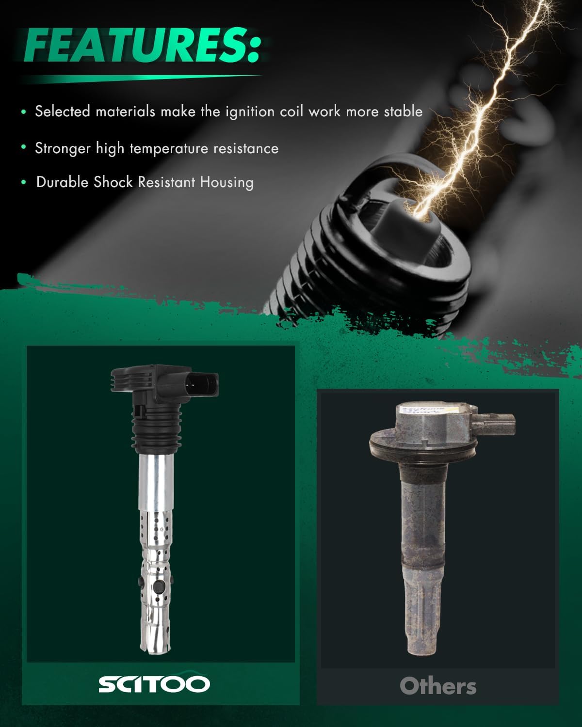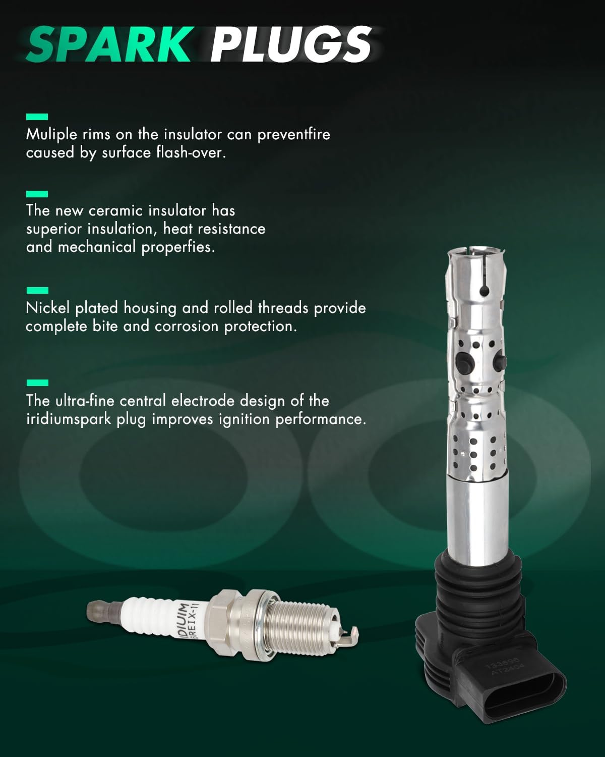 SCITOO ignition coils 4+Spark Plugs 4 4pcs Replacement for P-assat 1.8L 2001-2005,for J-etta 1.8L 2001 2002 2003 2004 2005,for A-udi A4 1.8L 2001-2007 Replace UF411 UF-437, UF-580, CO044