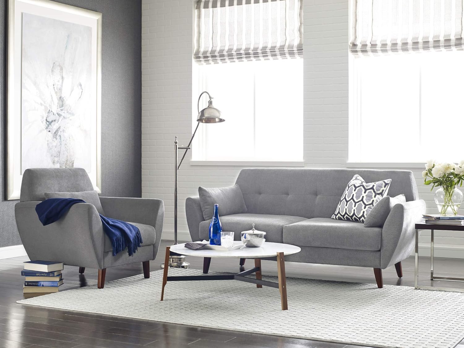 Great for small spaces, the Serta Artesia Collection Armchair is a smart and simple way to introduce the midcentury look to your living room, office space, or dorm. Featuring a tufted back with a matching pillow, this stylish armchair adds an on-trend designer look to any room. The microfiber-style fabric upholstery is easy to clean and comes in classic colors to fit your living space, while the hardwood construction offers exceptional durability for years of reliable use. The Artesia Armchair ships in one convenient box and assembles easily with no need for tools. Match this piece with others in the Serta Artesia Living Room Collection, such as the 61-inch or 73-inch Artesia loveseat, to create a stylish and coordinated look in your home.