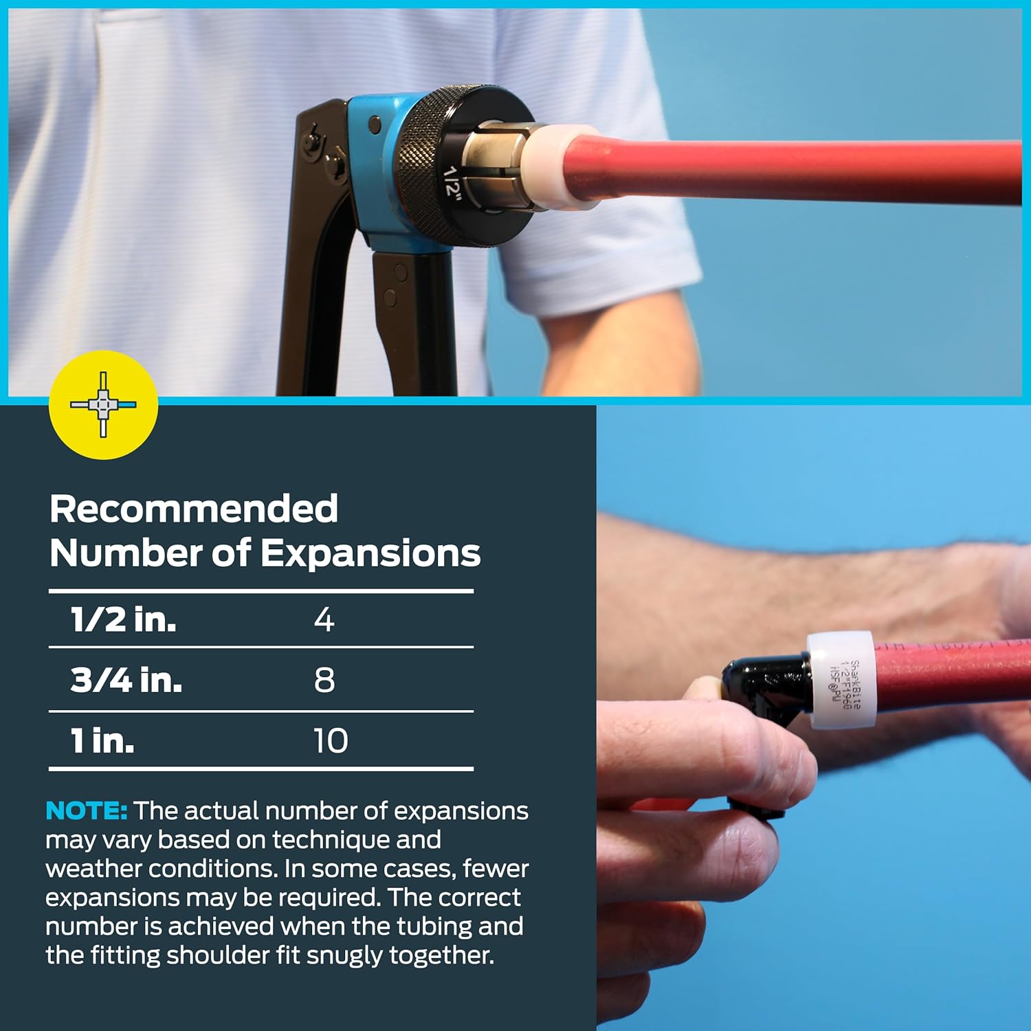 The SharkBite PEX-A expansion tool kit is designed to expand PEX-A pipe for ASTM F1960 expansion fittings. This toolkit includes a ratcheting manual expansion tool, three interchangeable expansion heads (1/2 in., 3/4 in., and 1 in.), lubricant, and a convenient carrying case. The expansion tool features an auto-rotating ratcheting mechanism, allowing for even and consistent expansion. This plumbing tool kit is compatible with the F1960 standard PEX expansion system, and is intended for use only on PEX-A tubing. Expansion tools allow for quick and easy installation; no solder or bonding agents required.