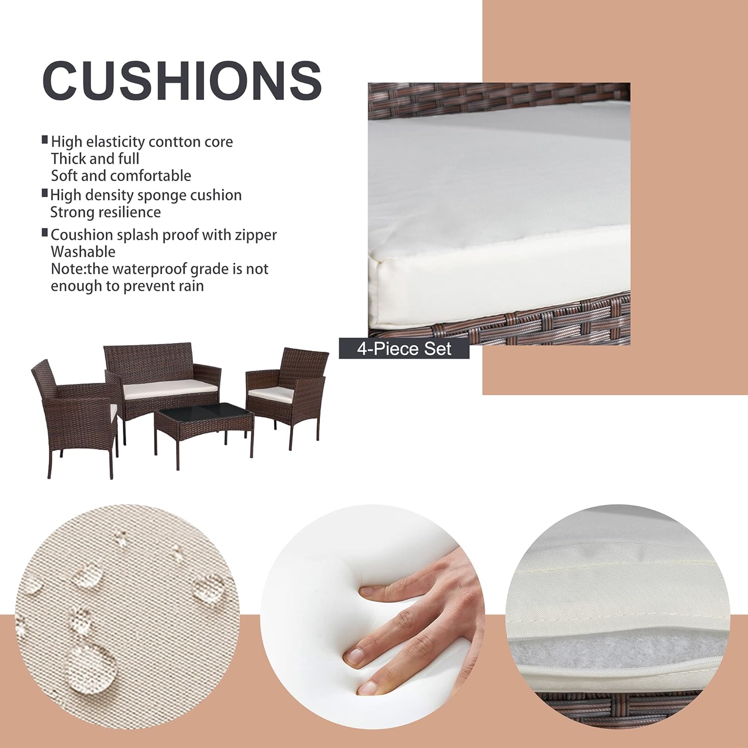 Shintenchi 4 Piece Outdoor Patio Furniture Set, Wicker Rattan Patio Conversation Set, Outdoor Chairs and Loveseat with Coffee Table for Porch, Yard & Poolside (Brown)