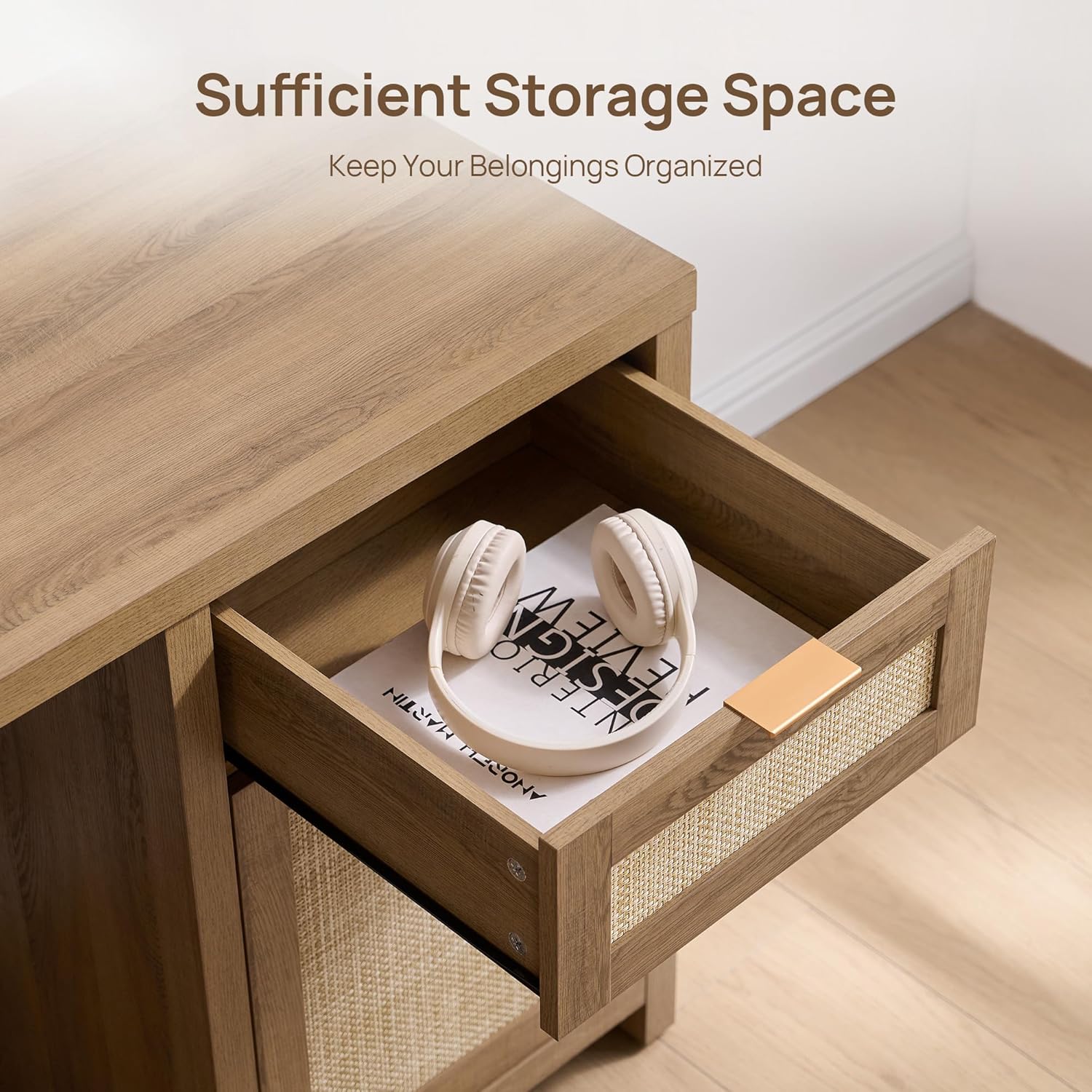 SICOTAS Rattan Executive Desk with Storage, 59" Boho Home Office Desk with Cabinets and Drawers, Large Computer Table Vanity Desk for Office, Study, Living Room, Oak