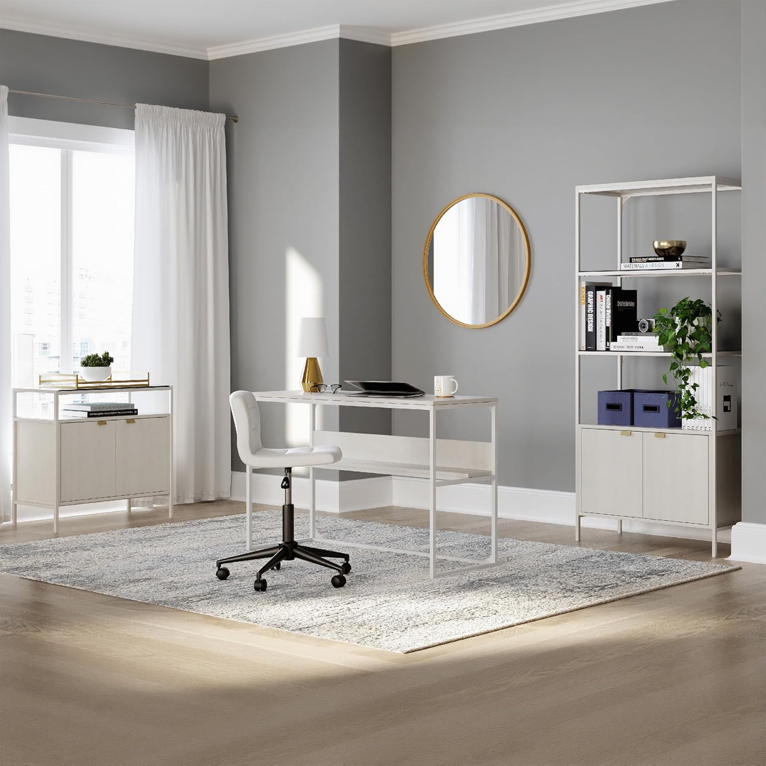 Bring your vision of a modern home workspace to life with this sleekly designed home office desk. Its linear construction and white finish keep things minimal. A small shelf along the back rounds out the versatile, striking desk. Creating an ideal at-home workspace starts with finding a home office desk with the right size, features and look. We know that the way you work most efficiently is unique to you, so we offer a wide variety of home office furniture options to help you achieve your goals. For gamers and work-from-home warriors alike, our home office desk solutions are the ideal way to complete your space.
