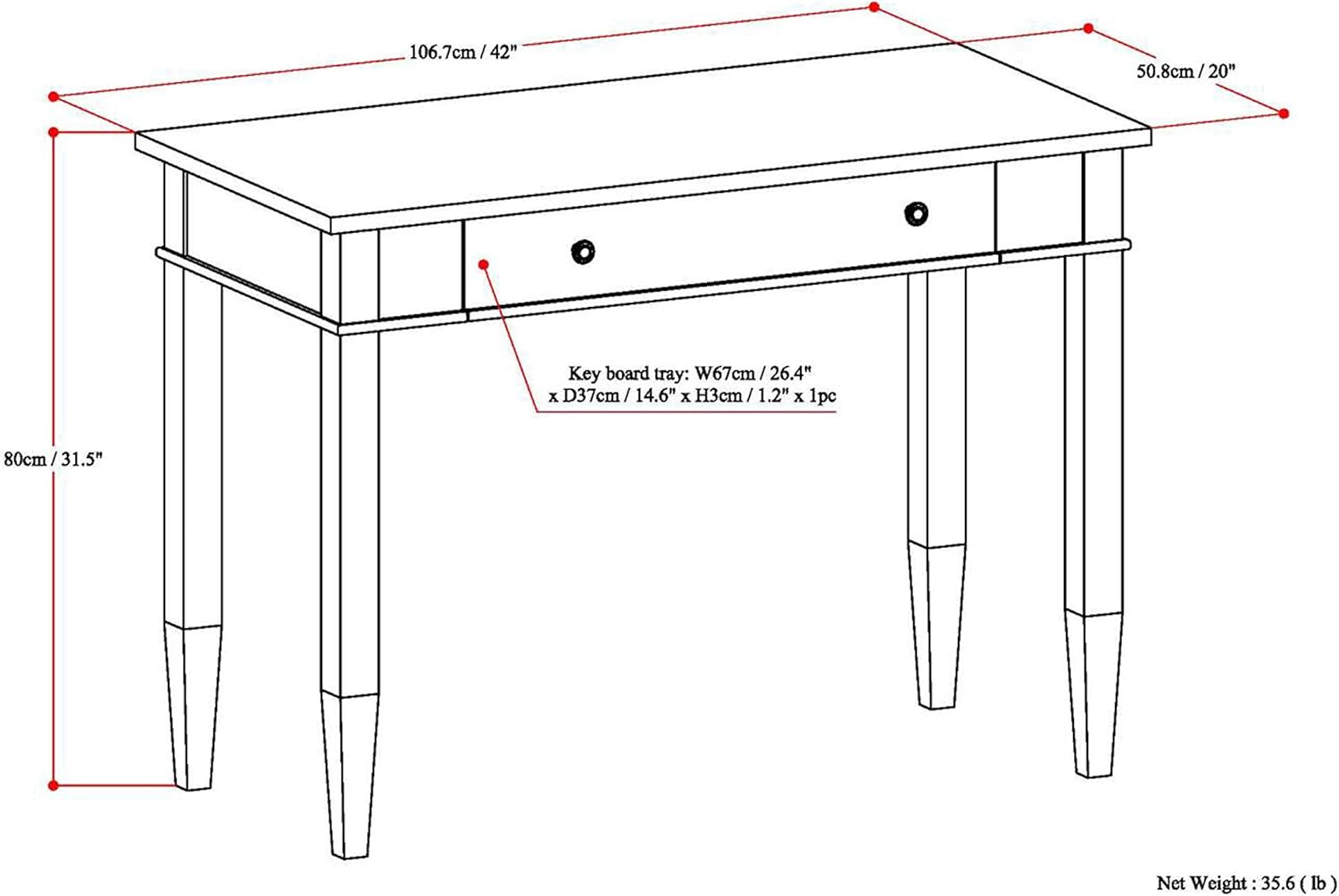 Your home office can be your special place again with this beautiful and functional office desk . Enjoy comfortable computing and work from home or office with the Carlton Desk. Its large surface area is ideal for a monitor, laptop or tablet and leaves enough room for paper, books and other writing accessories. It features a pull-out keyboard tray behind a flip down drawer front. Ideal for the home office or living room settings where it can be used in place of a Console Table.