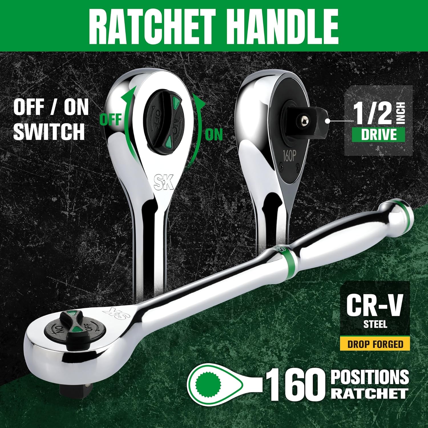 SK 1/2" Drive Socket Set with 160-P Ratchet, 34-Piece, SAE, SuperKrome Finish, Premium CR-V Construction, with EVA Foam Tool Organizer