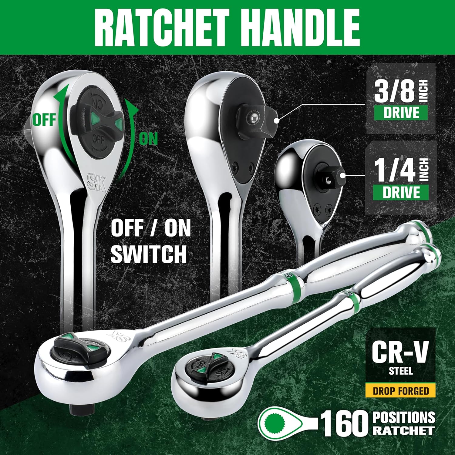 SK 1/4" & 3/8" Drive Socket Set with 160-P Ratchet, 105-Piece, SAE & Metric, SuperKrome Finish, Premium CR-V Construction, with EVA Foam Tool Organizer