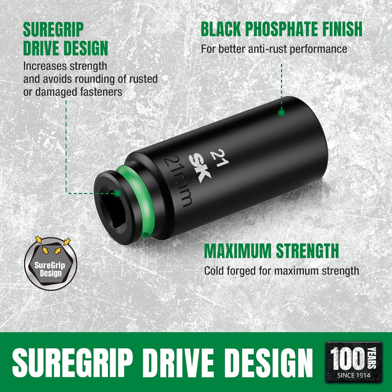 SK 3/8" Drive Impact Socket Set, Deep Metric Sockets, 13-Piece 8 to 21mm, Premium CR-MO Steel, SureGrip 6 Point Design, with Aluminum Socket Organizer