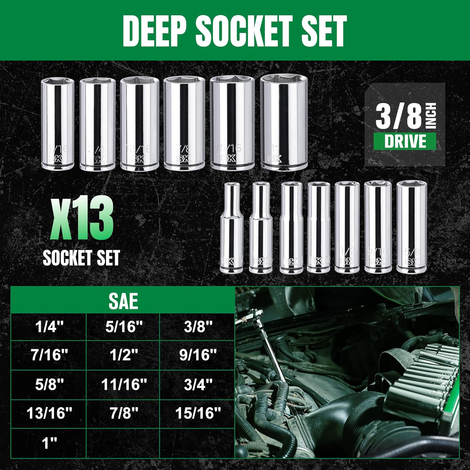 SK 3/8" Drive Socket Set, Deep SAE Sockets, 13-Piece 1/4" to 1", SuperKrome Finish, Premium CR-V Construction, with Aluminum Socket Organizer